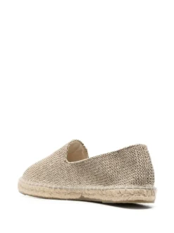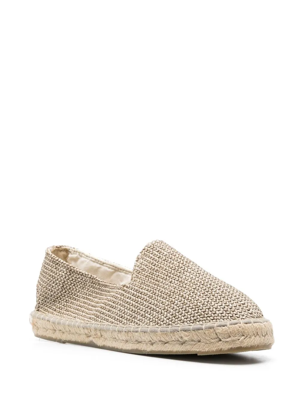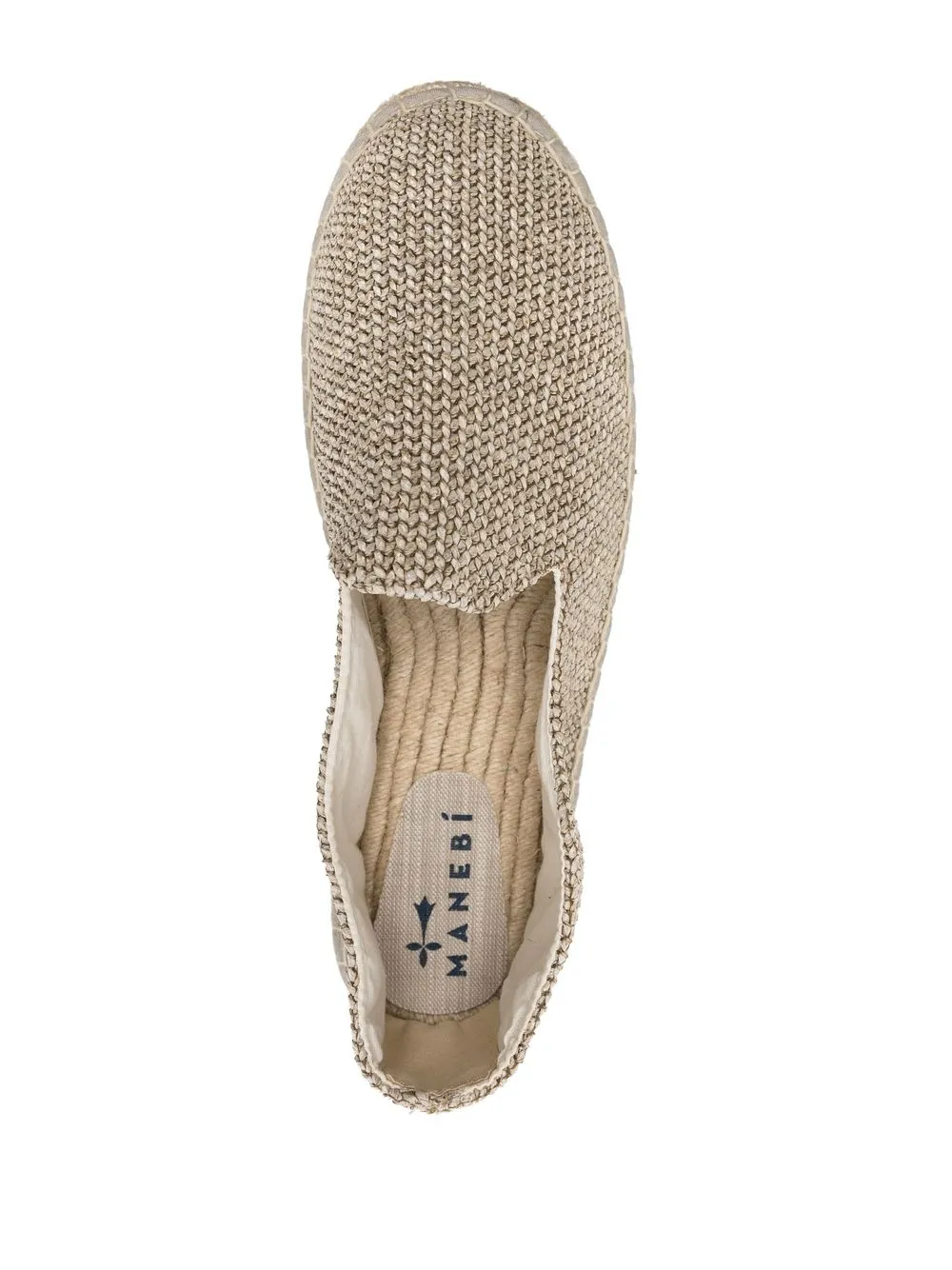 slip-on straw espadrilles from MANEBI featuring beige, straw, slip-on style, round toe, branded insole and jute sole.