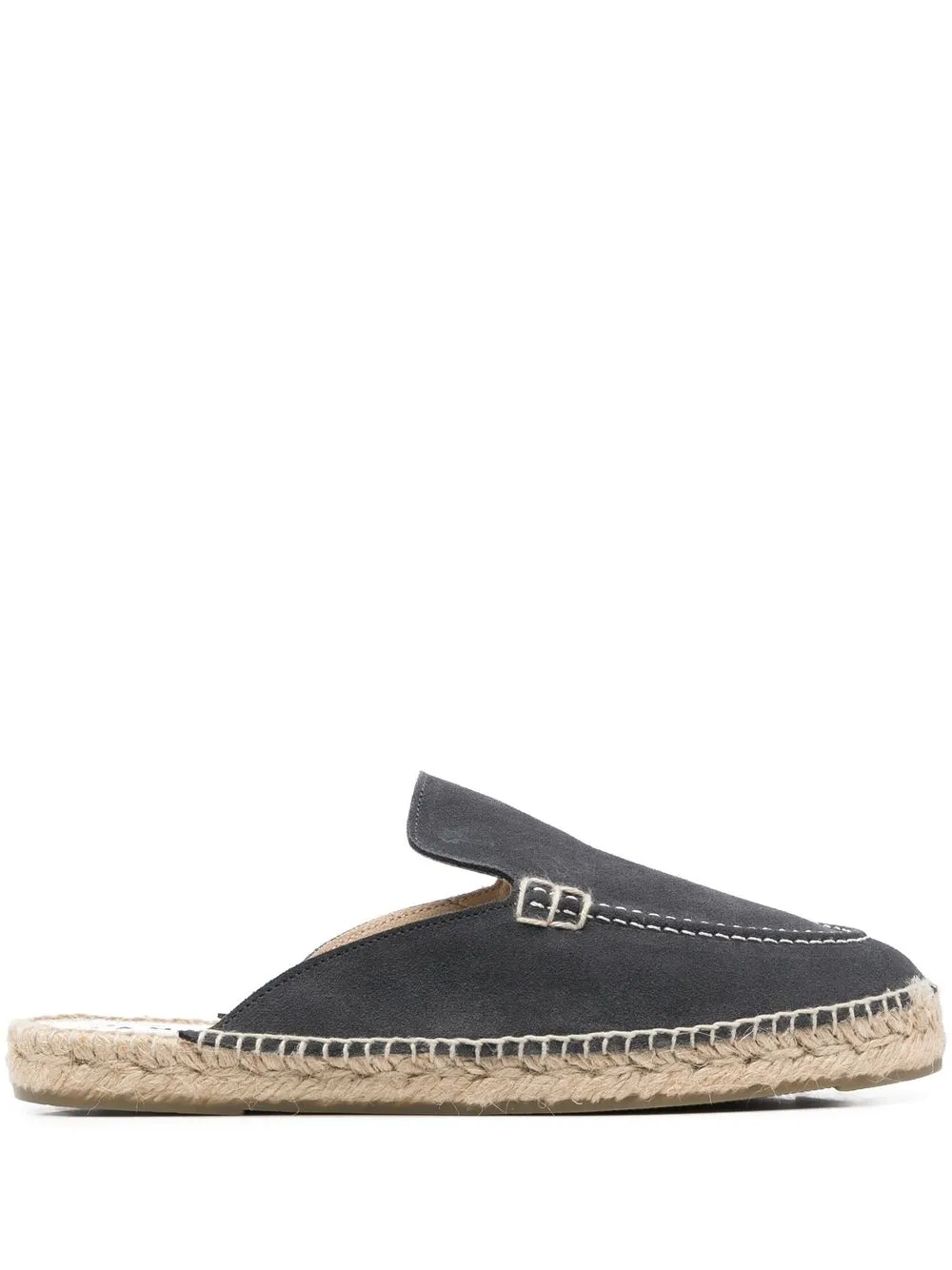 suede suede espadrille slippers from MANEBI featuring dark grey, branded insole, round toe, braided raffia sole and flat sole.