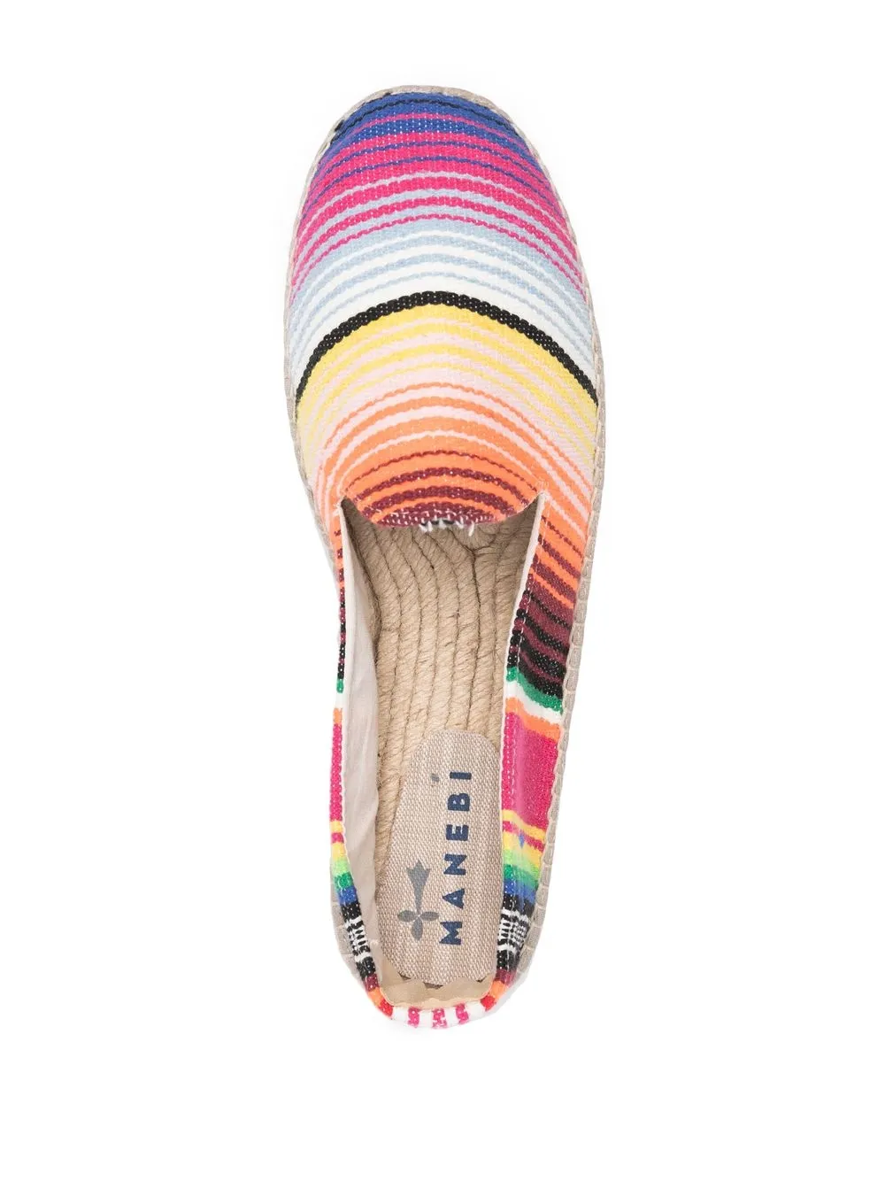 Tulum striped espadrilles from MANEBI featuring multicolour, canvas, stripe print, colour-block design, embroidered logo to the side, round toe, branded footbed, slip-on style and jute sole.