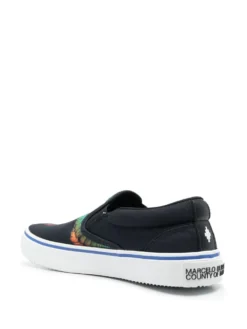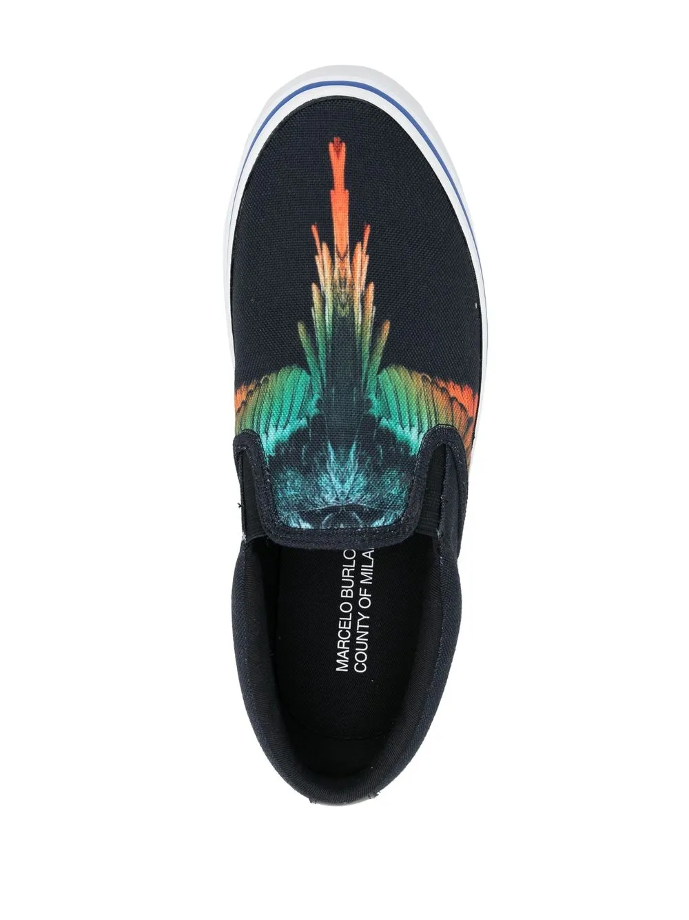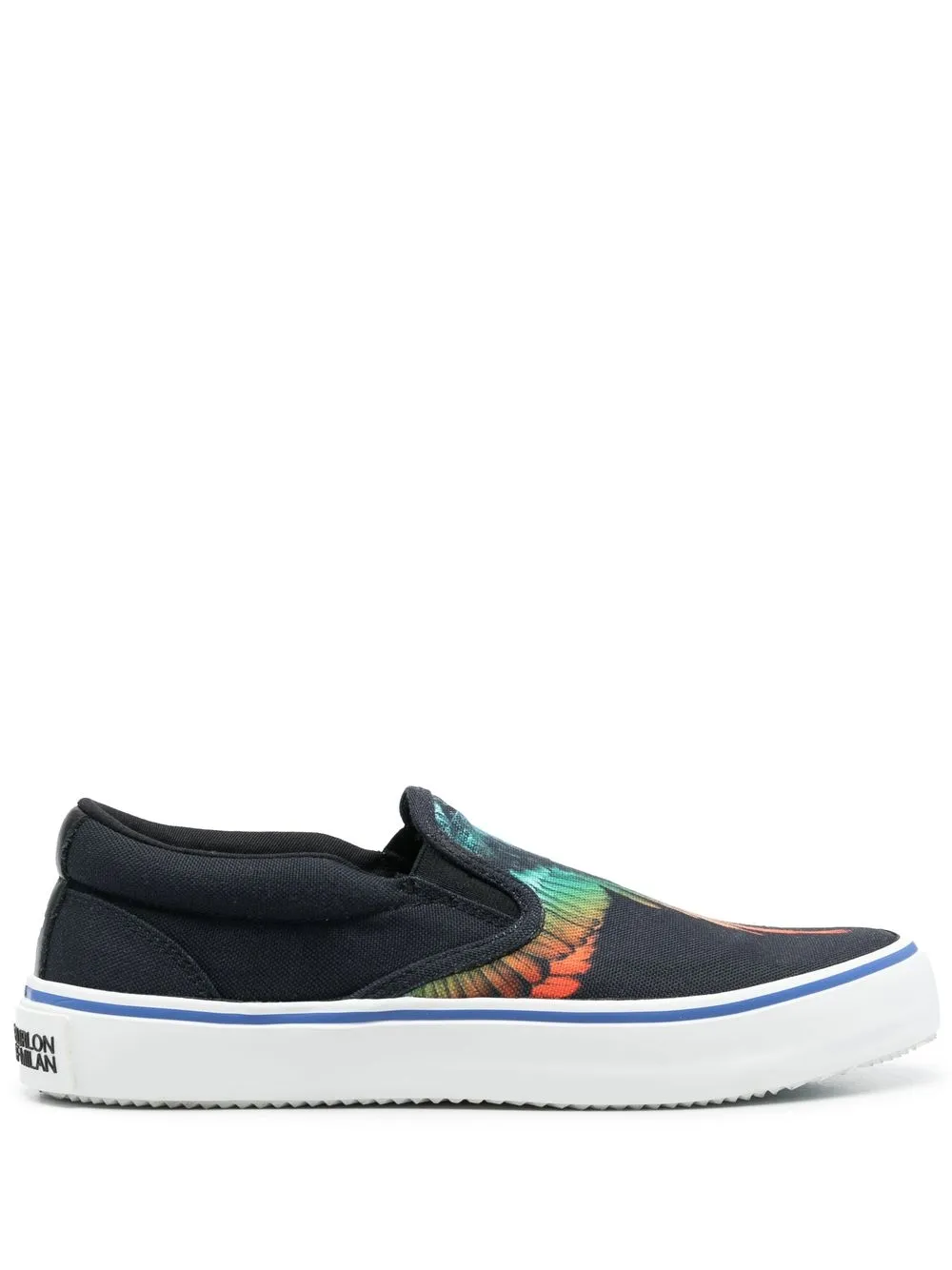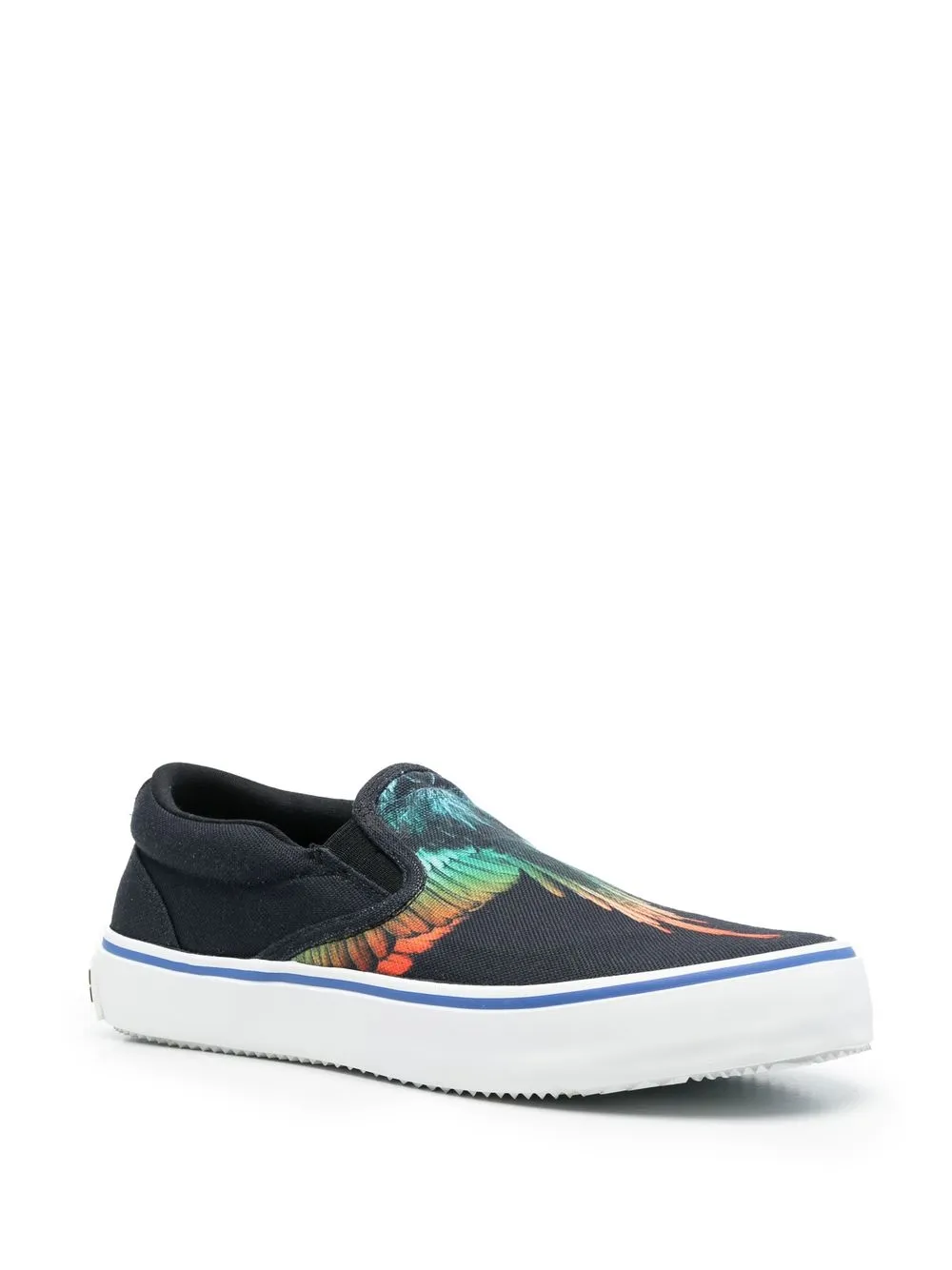 Wings-print slip-on sneakers from Marcelo Burlon County of Milan featuring black/multicolour, logo patch to the rear, signature Marcelo Burlon Wings print, slip-on style, branded insole and vulcanised-rubber sole.