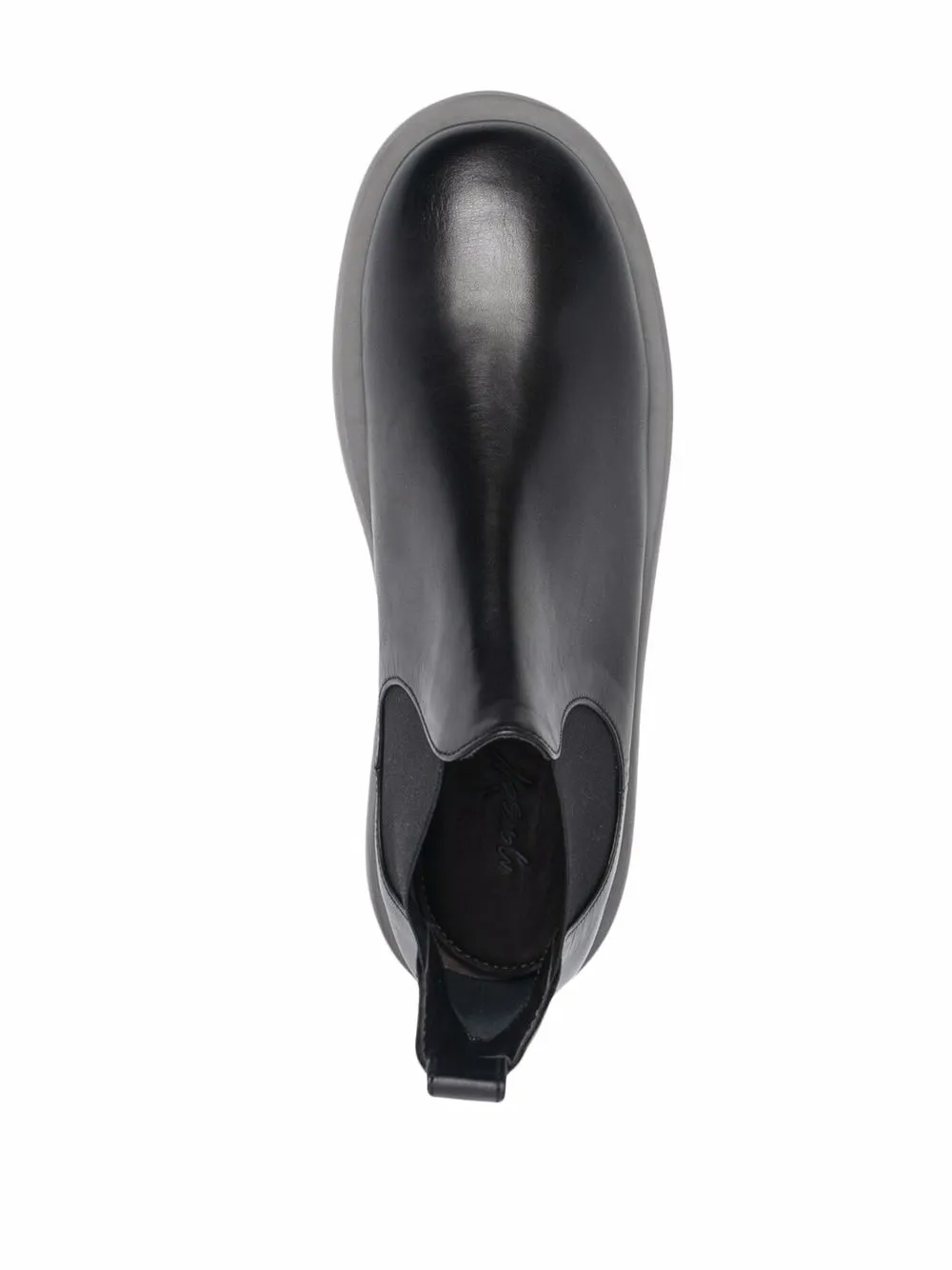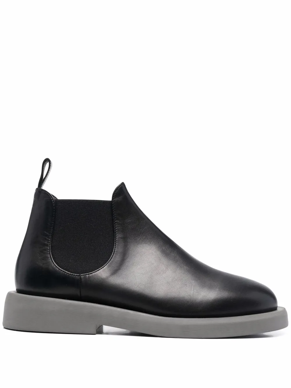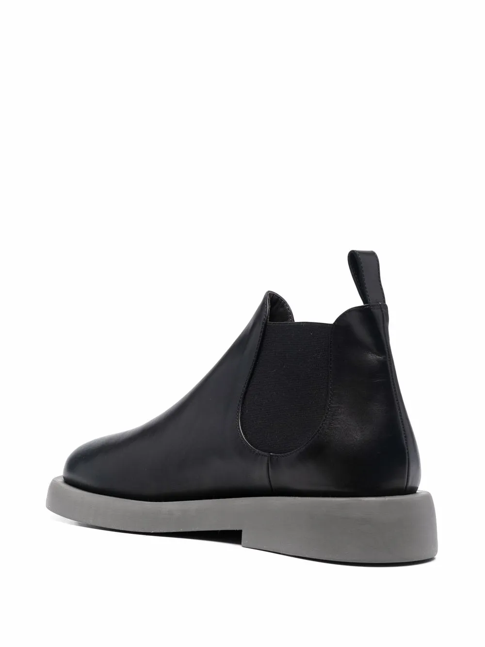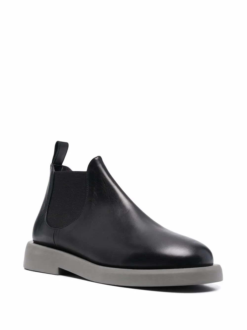 Black leather Gommello leather Chelsea boots from MARSÈLL featuring round toe, elasticated side panels, ankle-length, pull-tab at the heel and flat rubber sole.