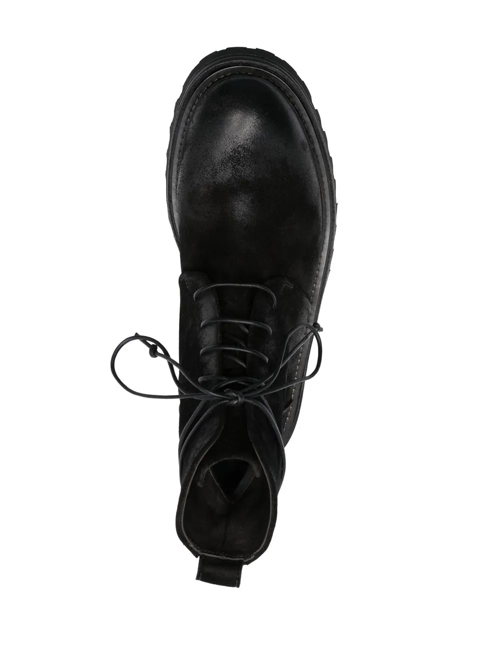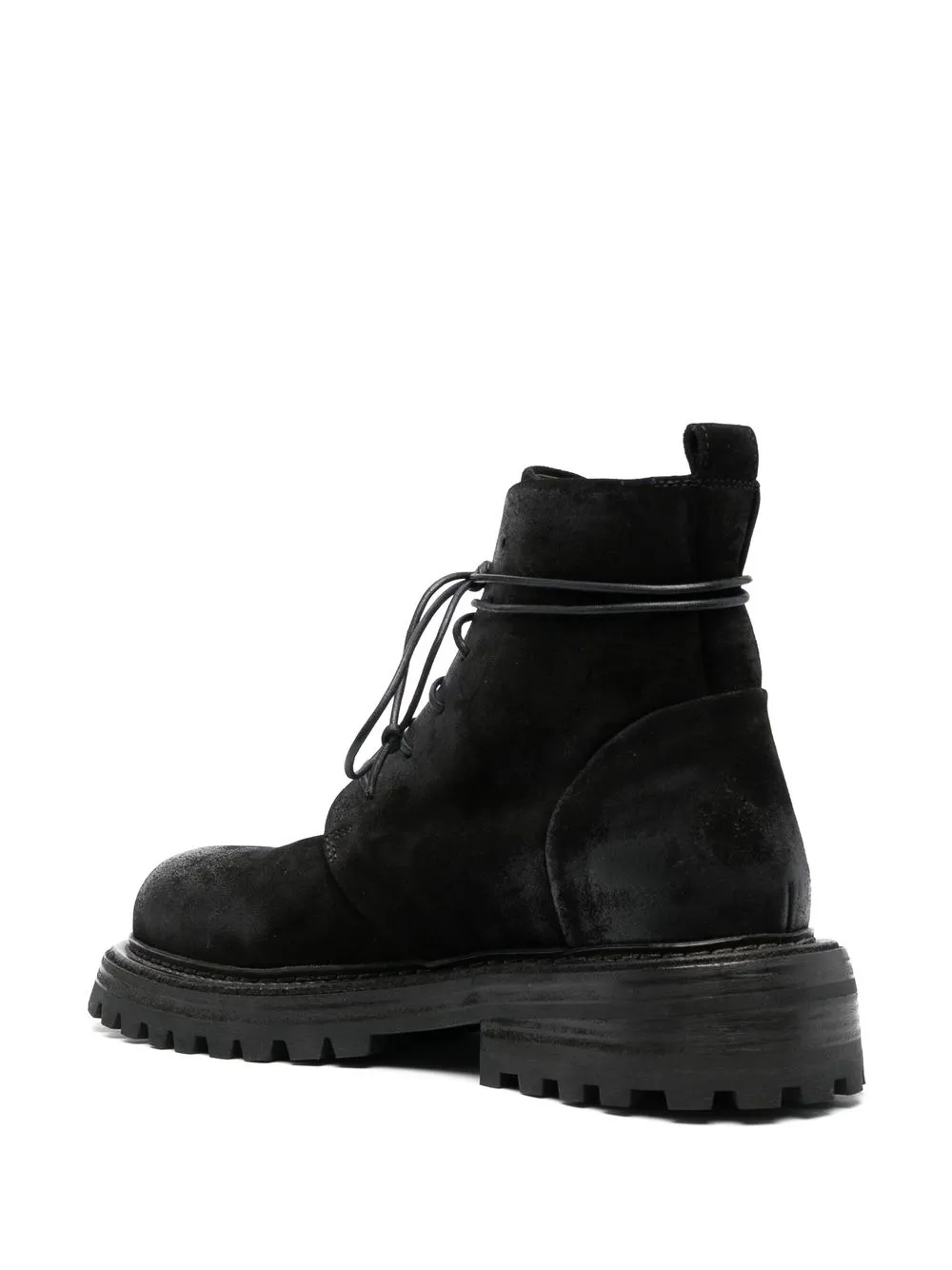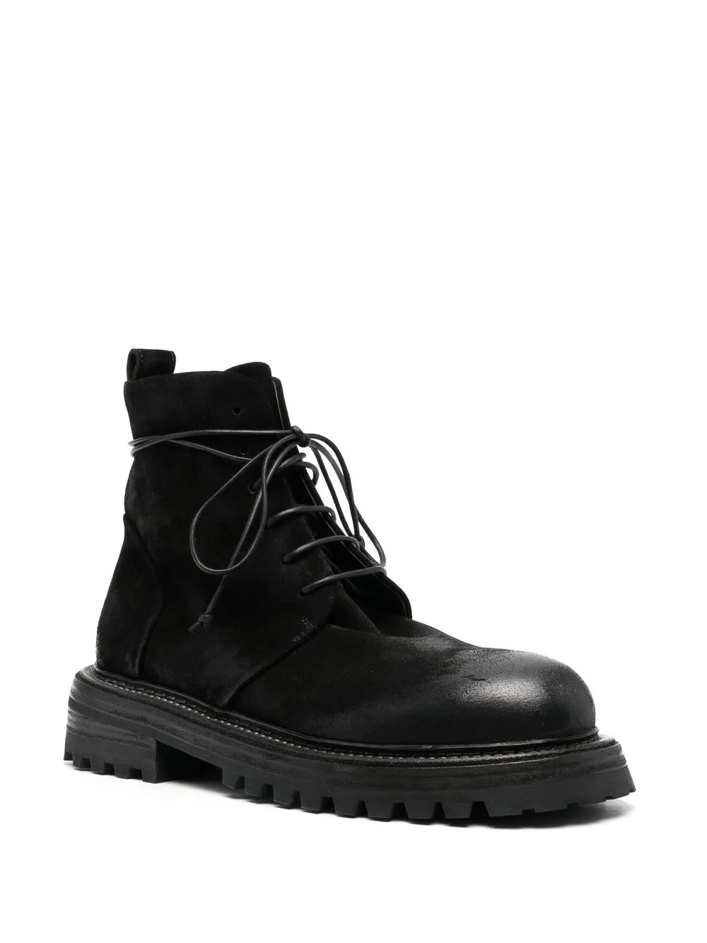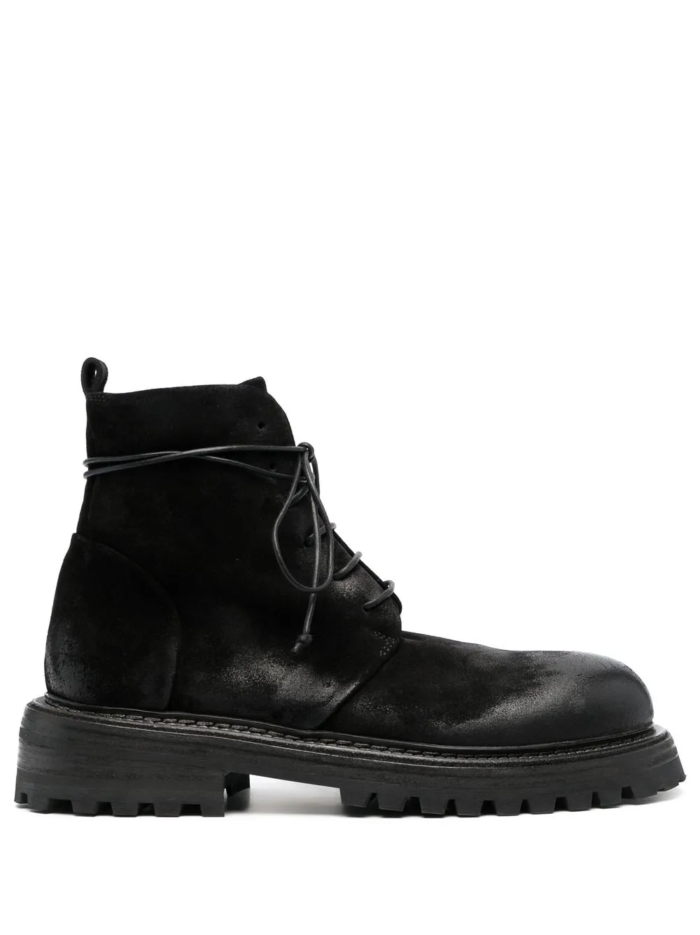 suede lace-up ankle boots from MARSÈLL featuring black, calf leather, calf suede, round toe, front lace-up fastening, pull-tab at the heel and ridged rubber sole.