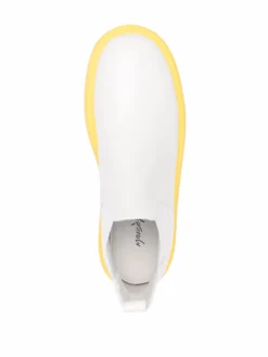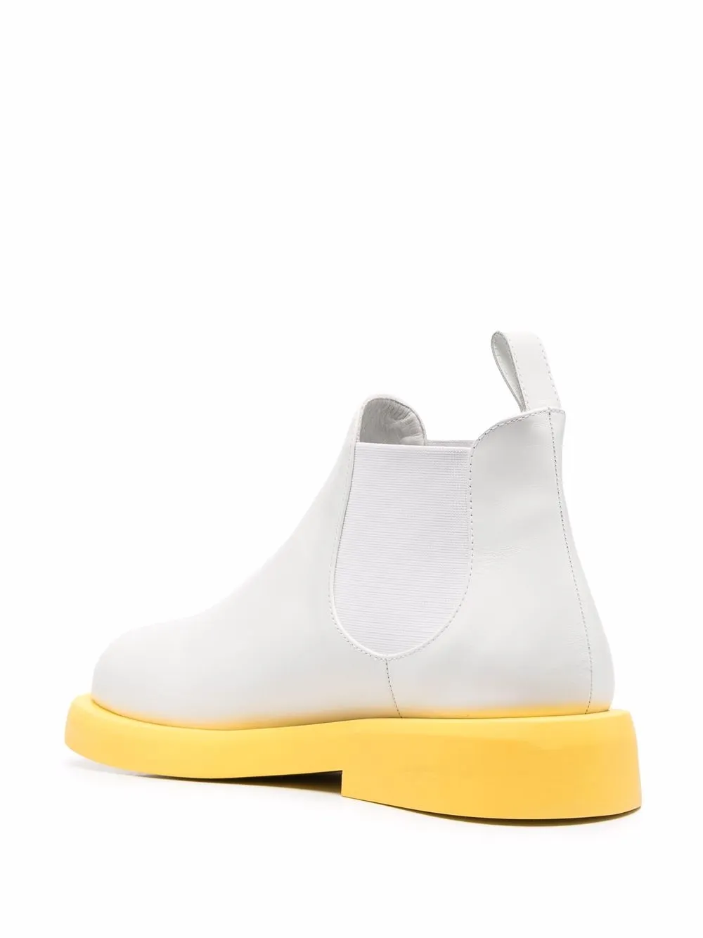 White/yellow leather two-tone leather ankle boots from MARSÈLL featuring two-tone design, elasticated side panels, pull-tab at the heel, branded footbed, round toe, slip-on style, ankle-length and low block heel.