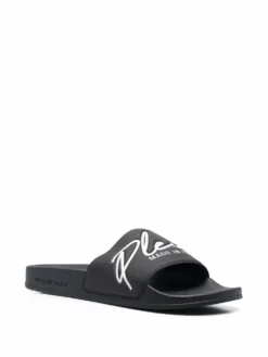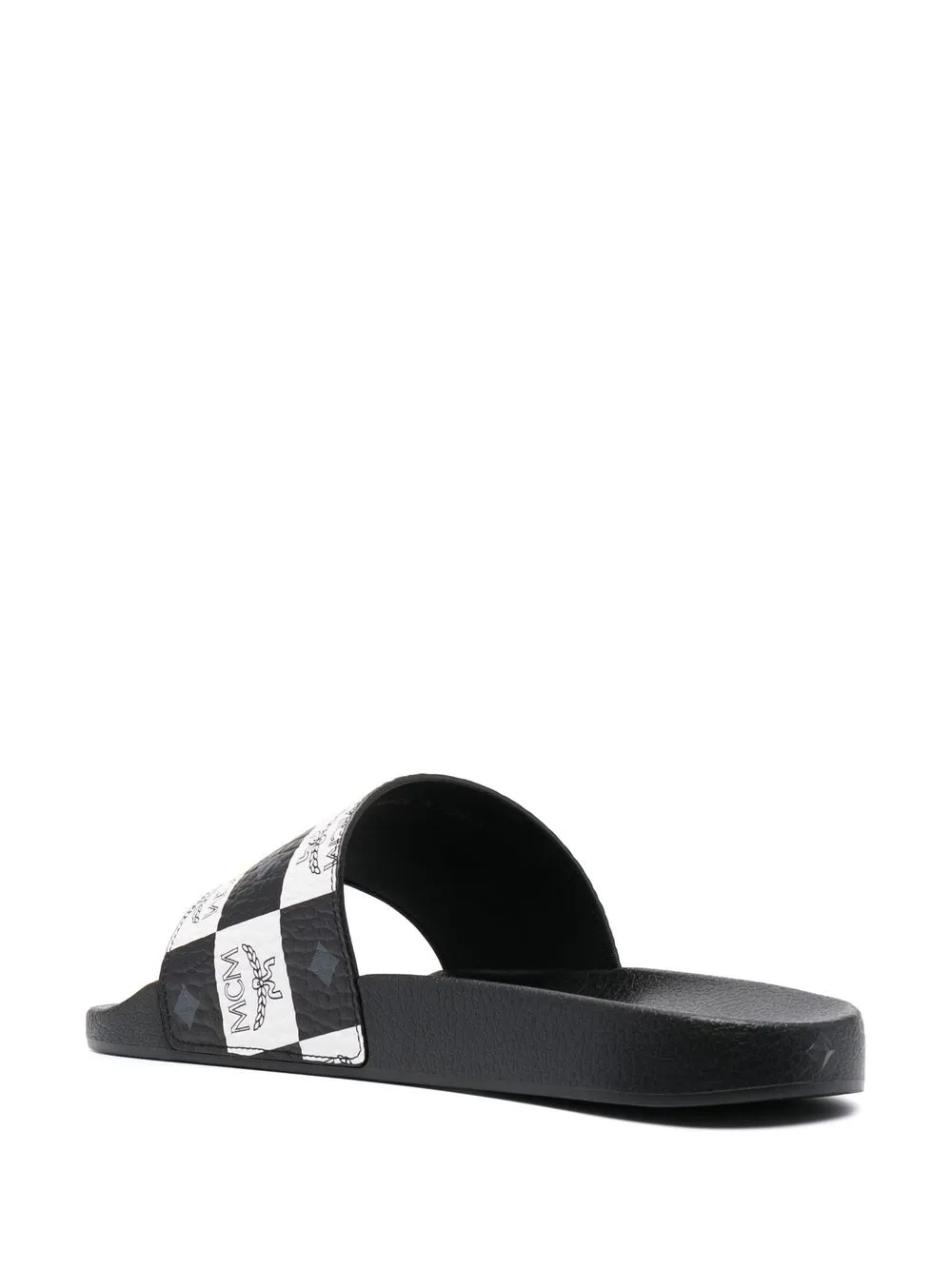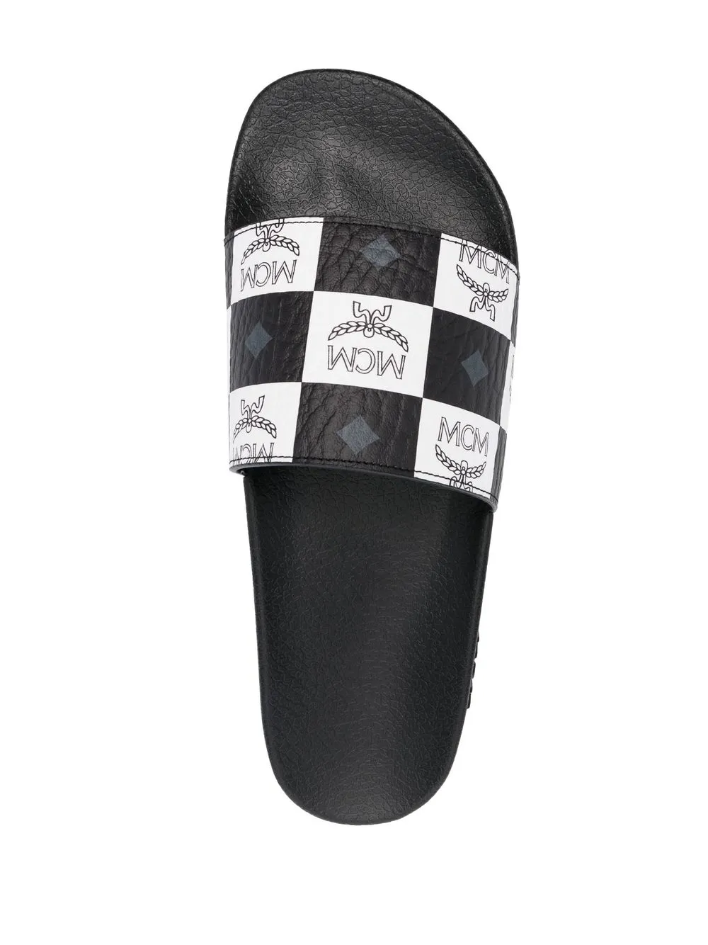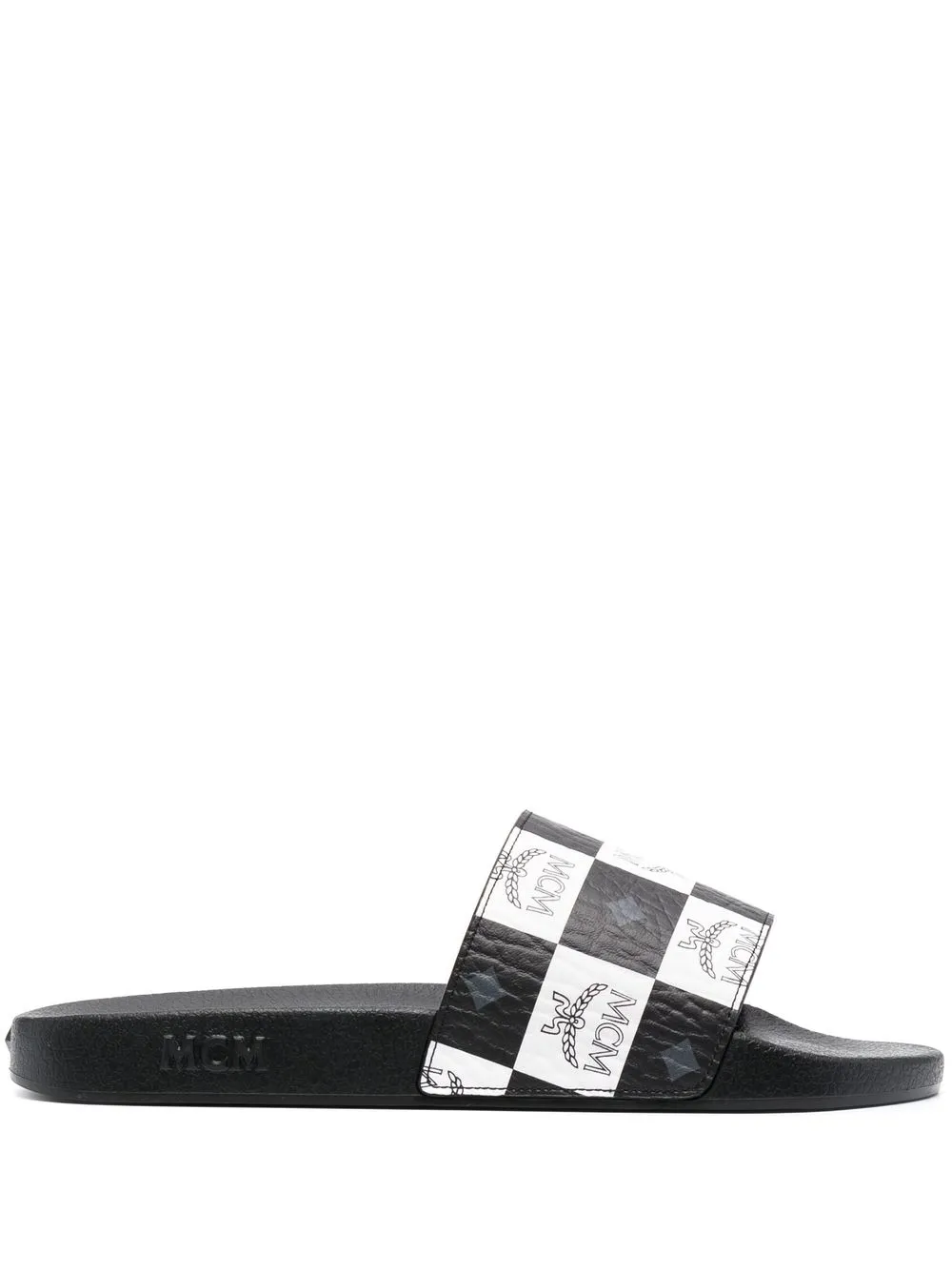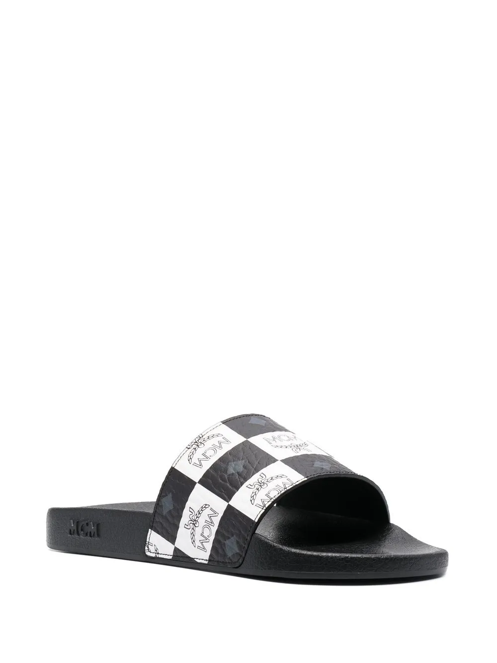 checkerboard logo-print slides from MCM featuring black/white, leather, checkerboard print, all-over logo print, open toe, slip-on style and flat rubber sole.