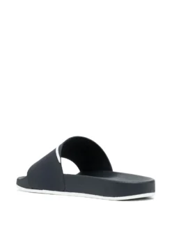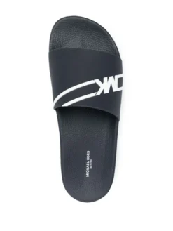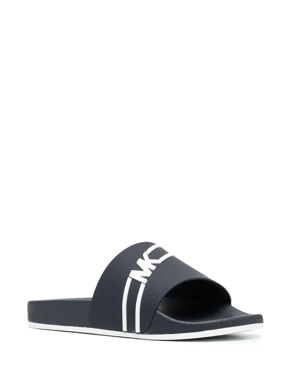 Dark blue/white Jake logo slides from MICHAEL MICHAEL KORS featuring logo print to the front, round toe, branded insole, flat rubber sole and slip-on style.