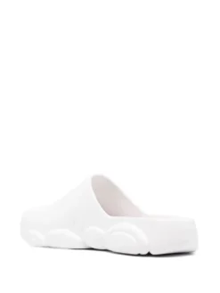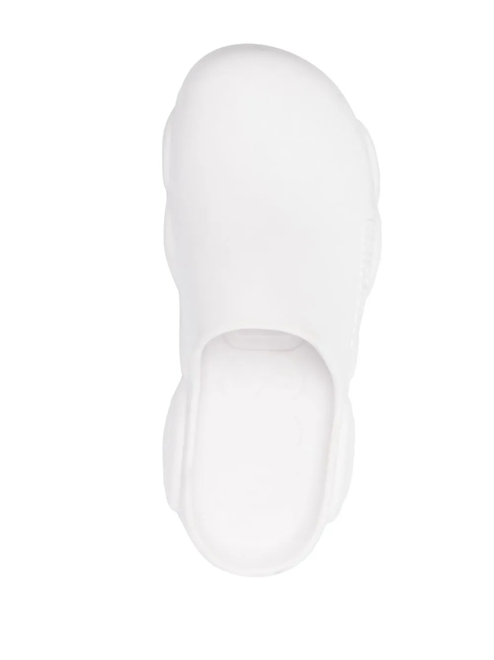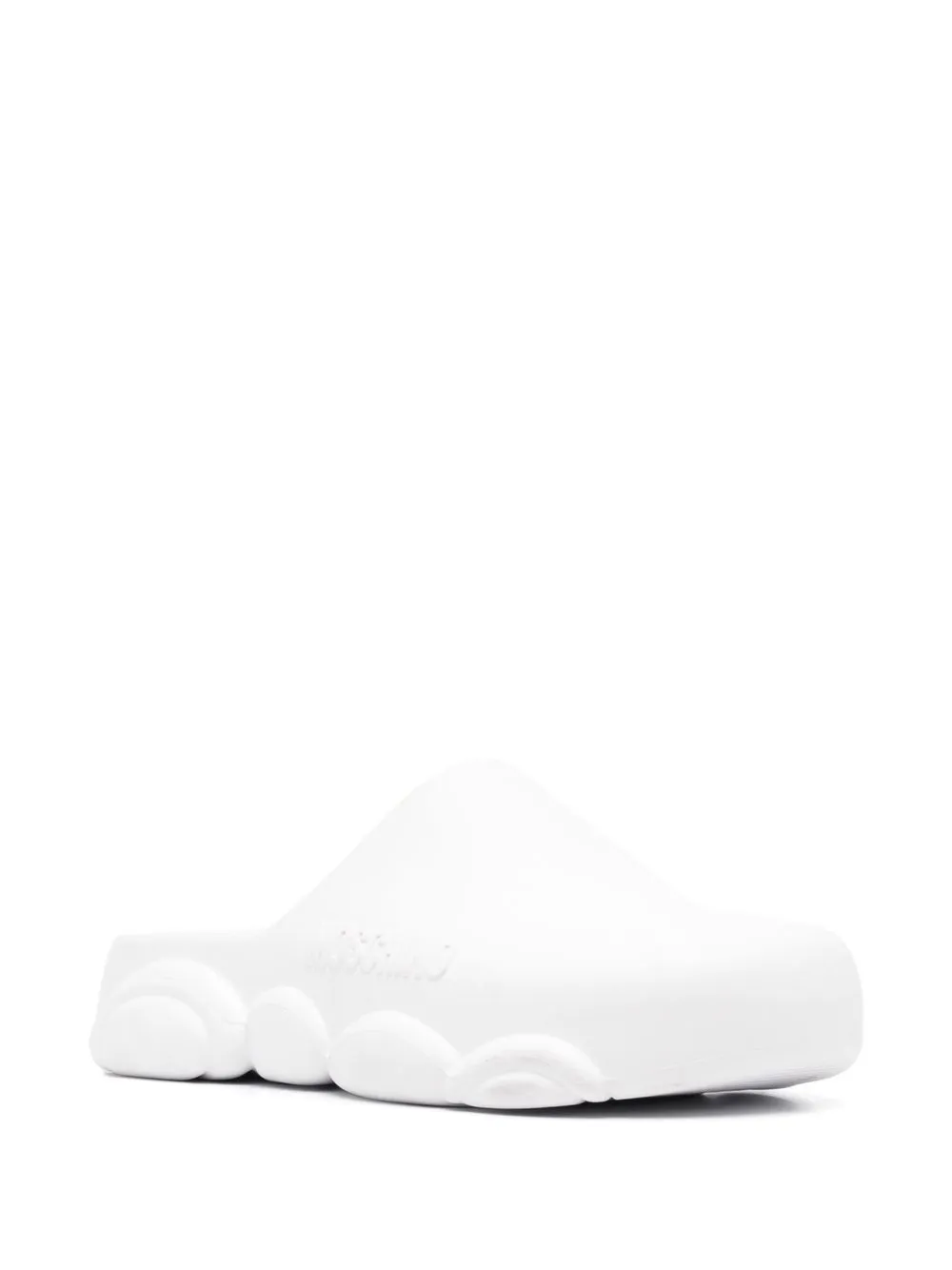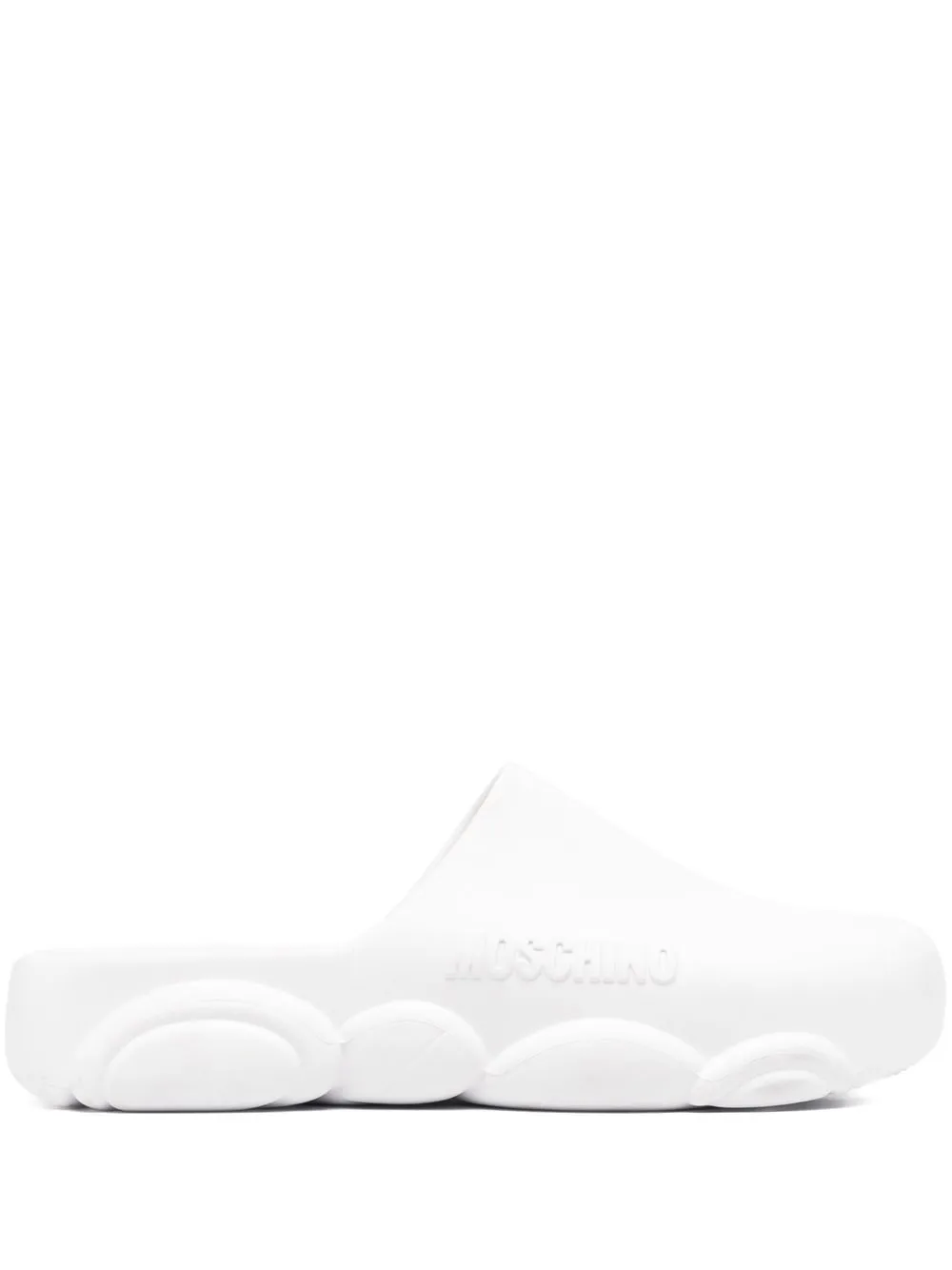 debossed-logo detail slides from MOSCHINO featuring debossed logo to the side, cloud white, slip-on style, round toe and flat rubber sole.