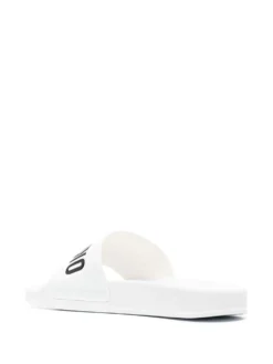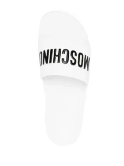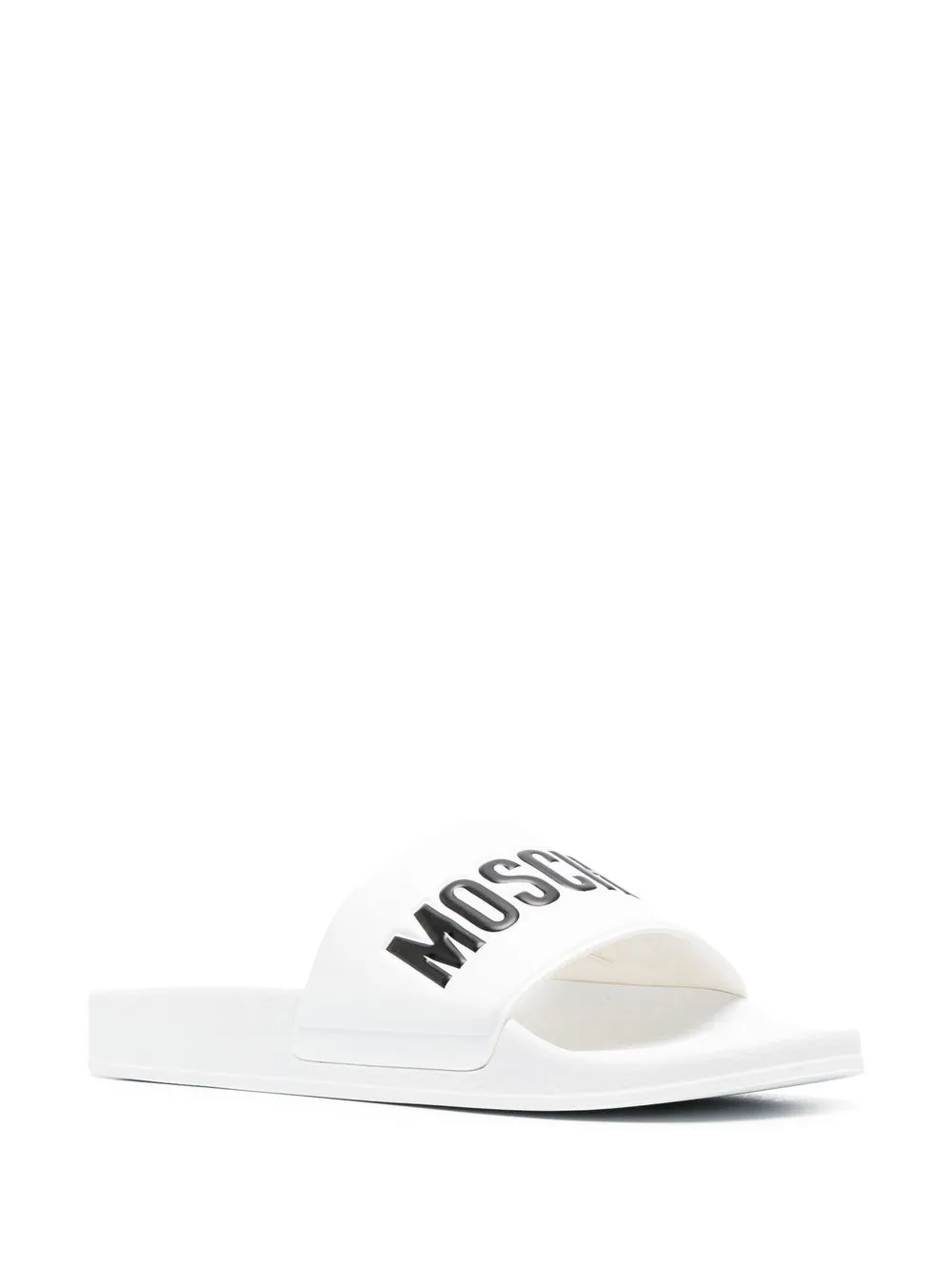 embossed-logo slides from MOSCHINO featuring white/black, embossed logo to the front, open toe, slip-on style and flat rubber sole.