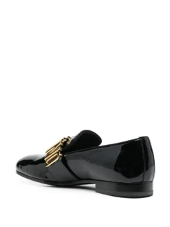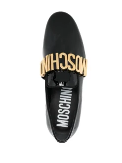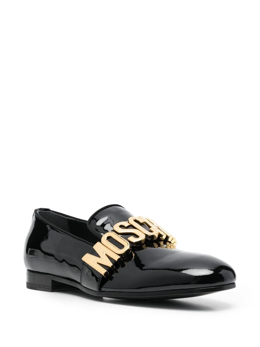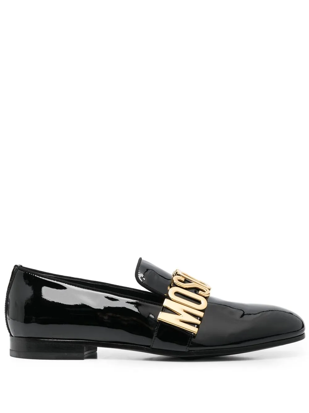 logo-lettering patent loafers from MOSCHINO featuring black, gold-tone, calf leather, glossy finish, gold-tone logo lettering, almond toe, branded leather insole, slip-on style and low block heel.