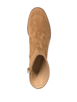 logo-plaque detail ankle boots from NEW STANDARD featuring camel brown, leather, ankle length, logo plaque, side zip fastening, round toe, branded insole and flat rubber sole.