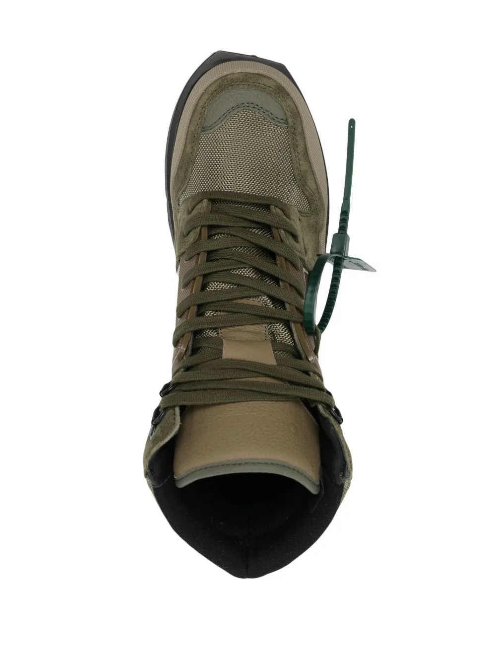 Made in Italy from smooth calf leather and suede, Off-White’s Hiking Sponge boots are rendered in a khaki camouflage-pattern iteration with a textured panelled upper. Boasting a signature safety tag motif, the pair sits atop a sponge-effect rubber sole.