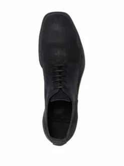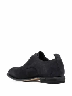 Black leather/buffalo leather Durga leather derby shoes from OFFICINE CREATIVE featuring front lace-up fastening, pull-tab at the heel, round toe, stacked heel, branded insole and flat leather sole.