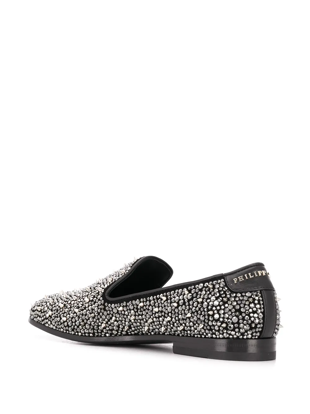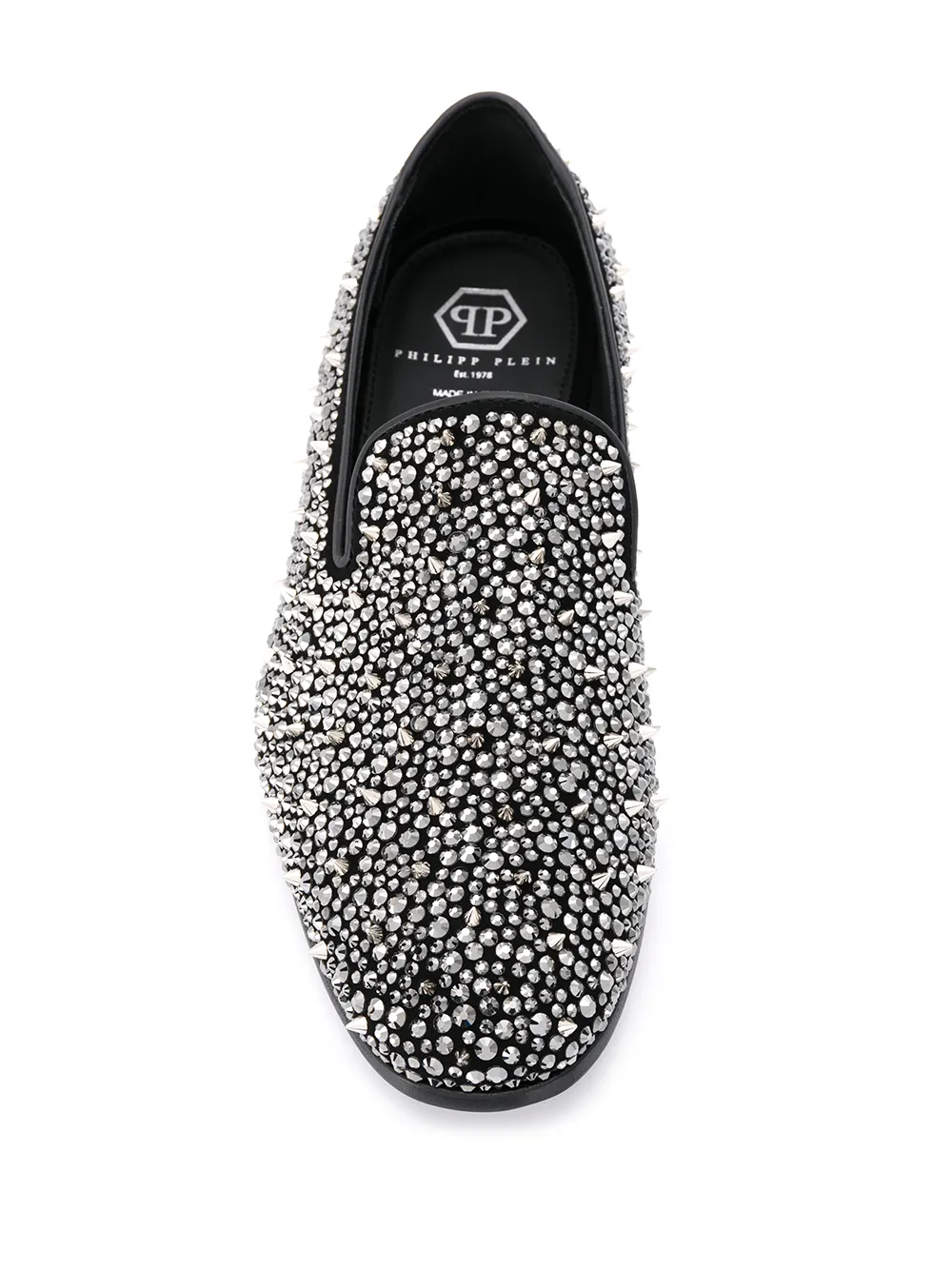 Black and silver-tone leather rhinestone studded loafers from Philipp Plein featuring a round toe, spike stud accents, rhinestone embellishments, a slip-on style, a branded insole, rear logo plaque, a low heel and a leather sole.
