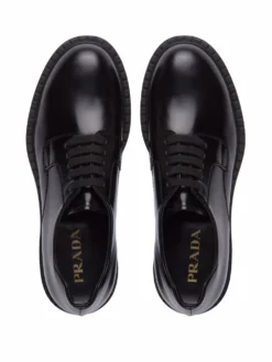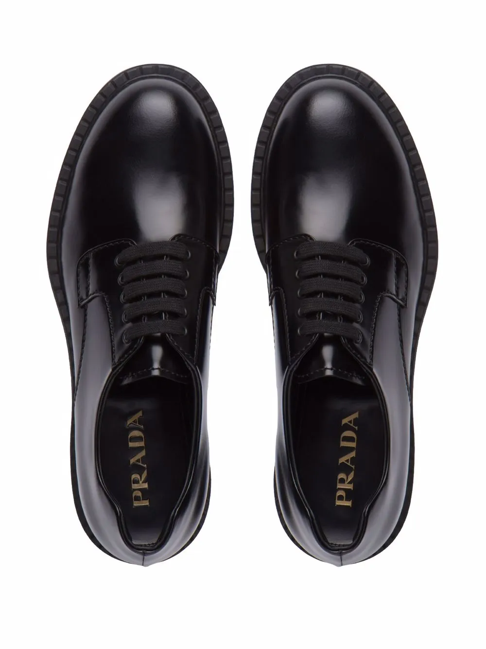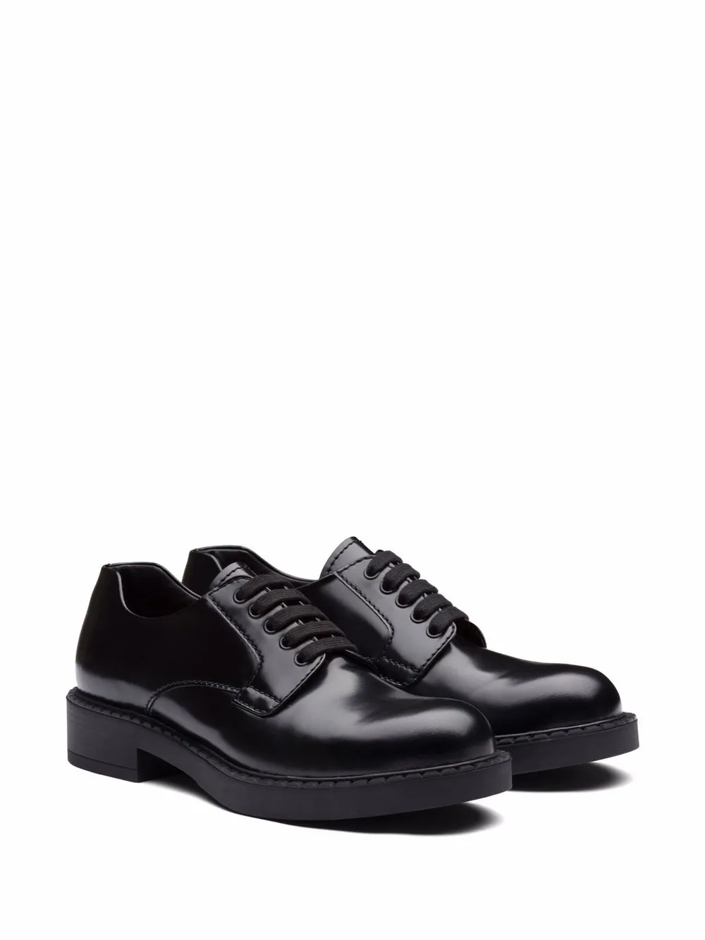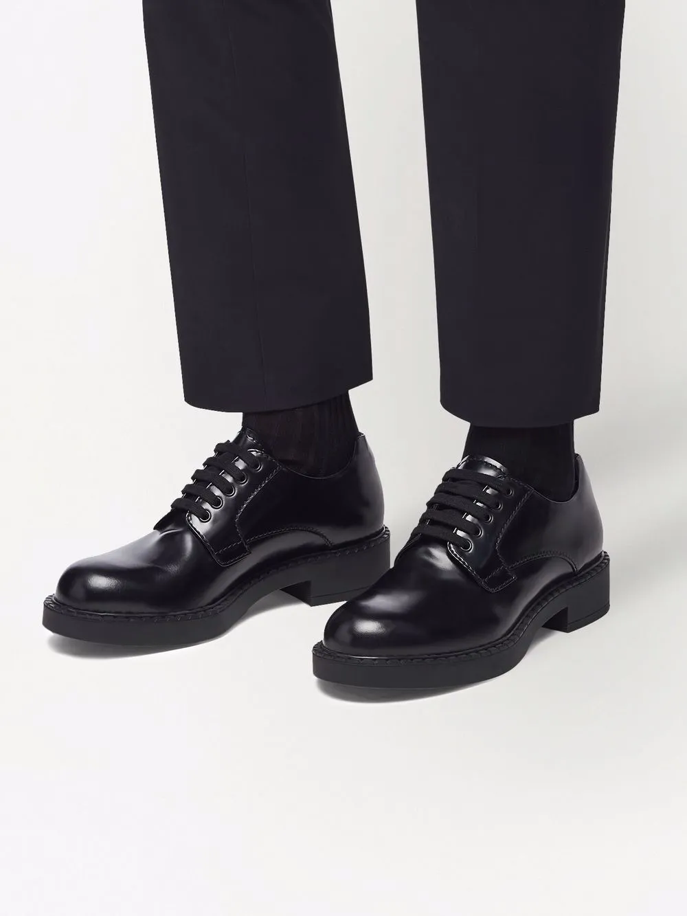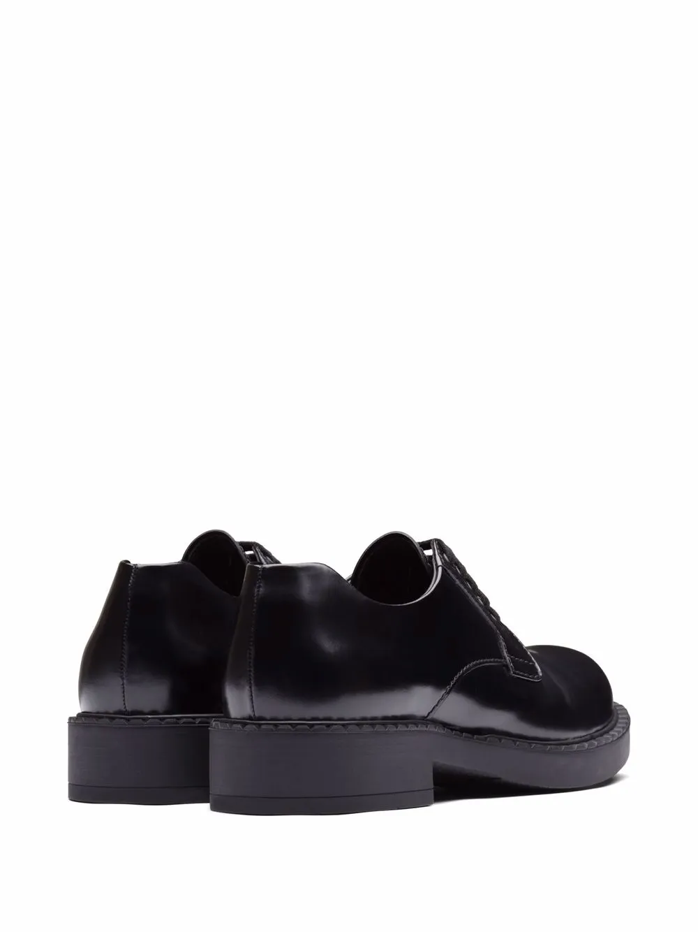 Showcasing the smooth, meticulous lines that have become synonymous with the brand, these Prada Derby shoes exhibit the refined craftsmanship for which the fashion house is known. Crafted from butter-soft leather, the ebony-black pair sit atop a stacked rubber sole.