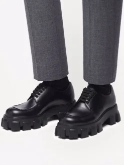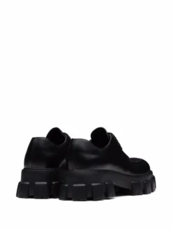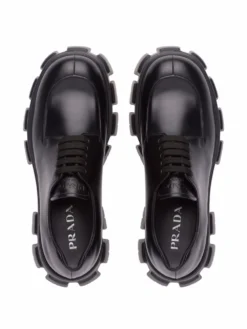 Prada footwear is forever in favour of chunky tread soles, military-inspired durability and timeless silhouettes. Ticking all three of the boxes, these Monolith lace-up shoes are crafted from brushed black leather and feature a low-top take on a classic pair, proving seamless harmony for any collection.Â