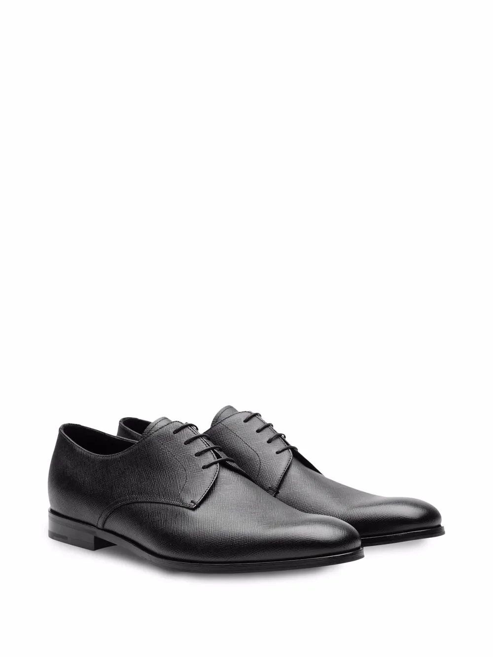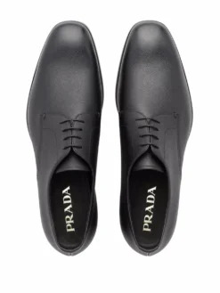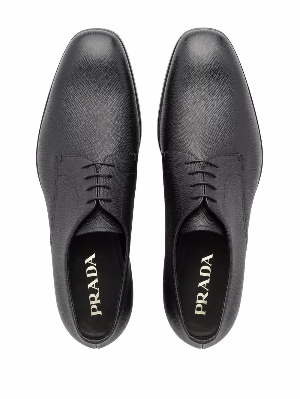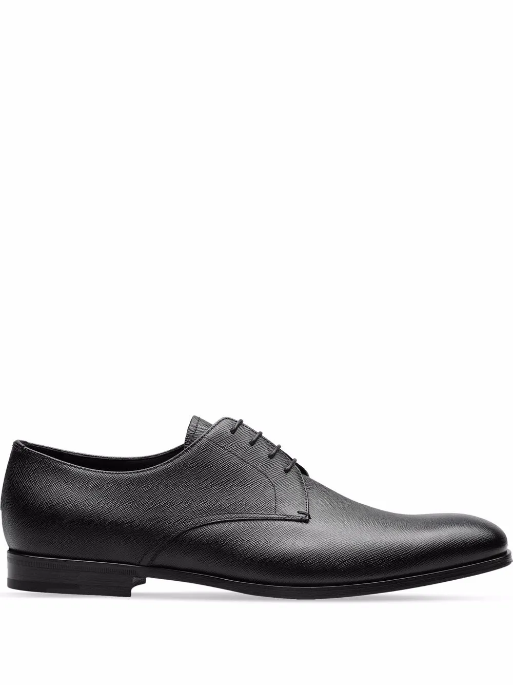 Channelling the house’s heritage and craftsmanship, these black Derby shoes from Prada’s SS22 edit are crafted from recognizable Saffiano leather and boast a formal almond toe and low block heel.