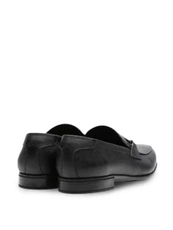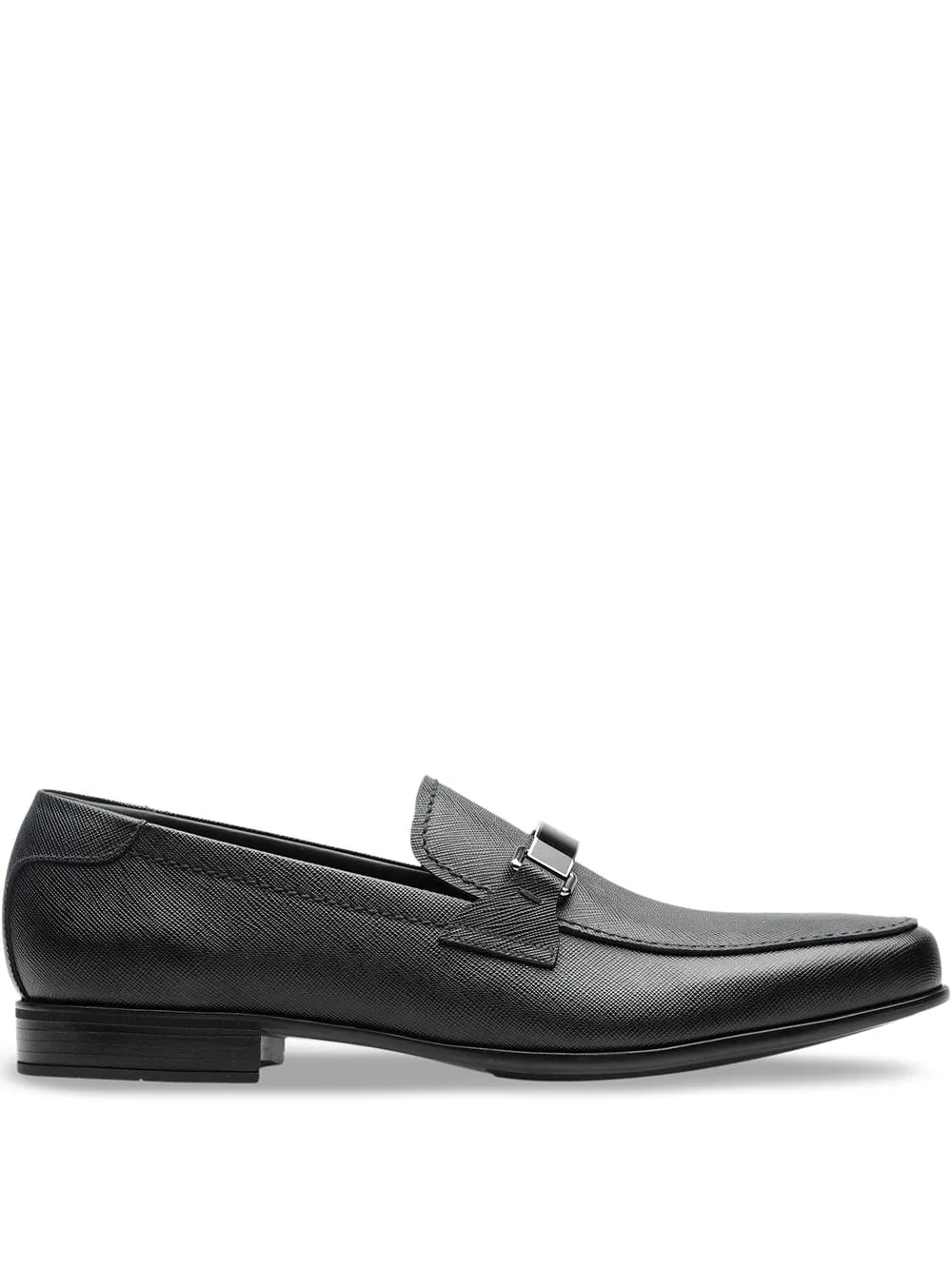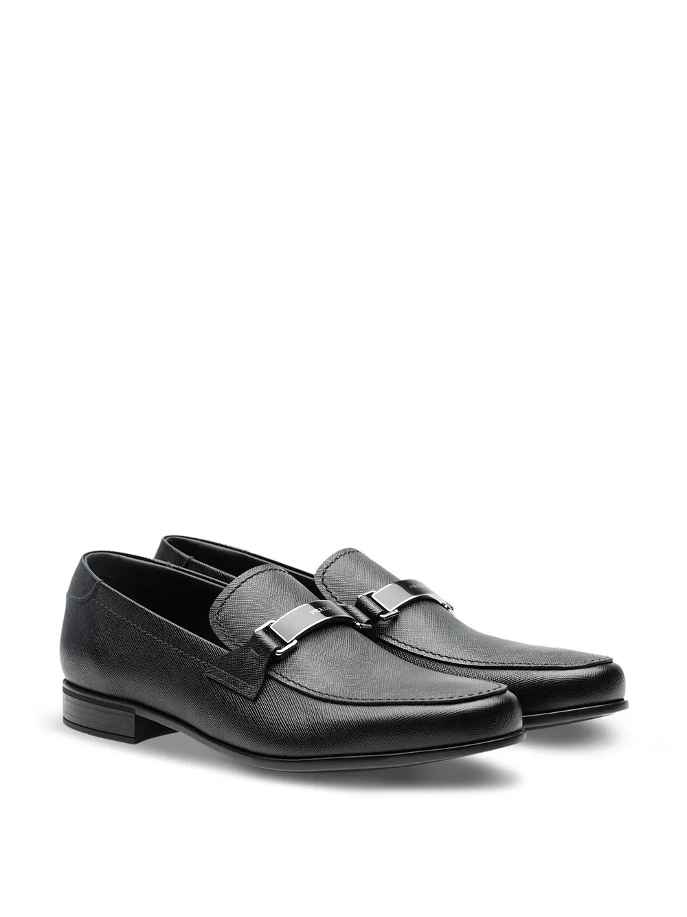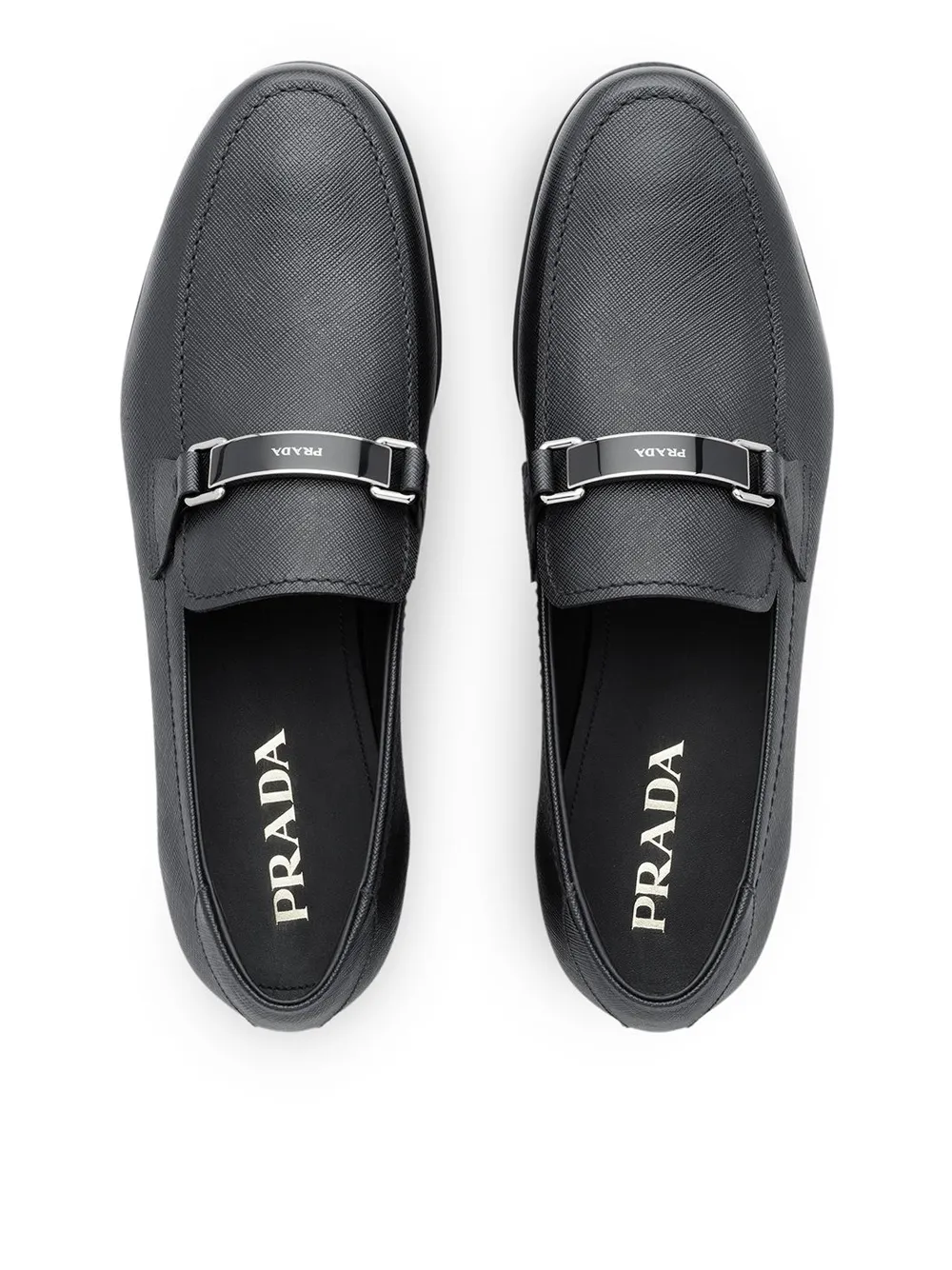 Chiefs in leather craftsmanship, Prada’s acclaimed Saffiano leather is consistently found throughout every collection. These black Saffiano leather loafers feature a round toe, a slip-on style, a flat rubber sole and a front logo plaque.