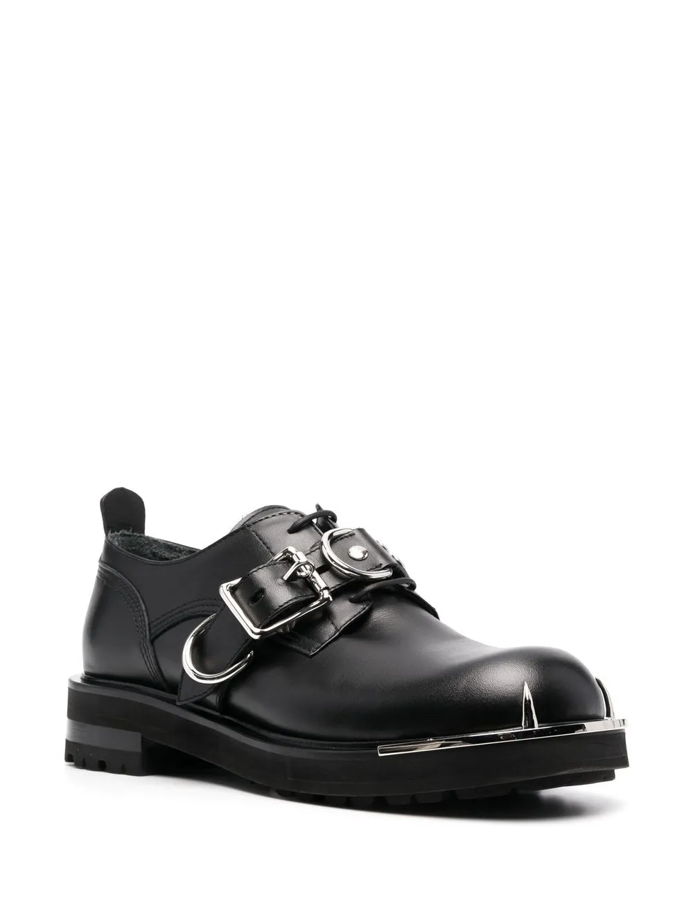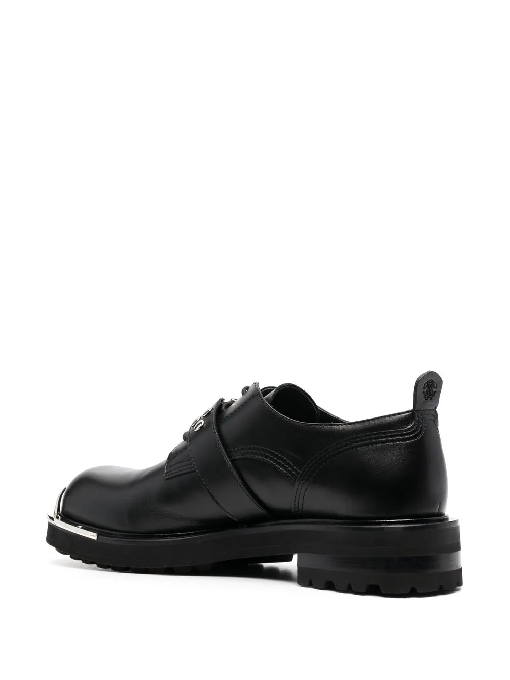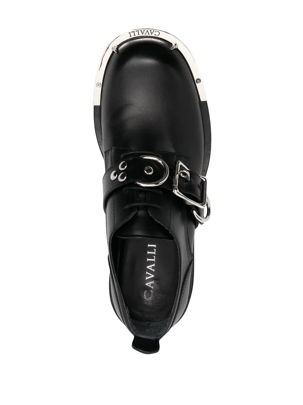 buckle-fastening monk strap shoes from ROBERTO CAVALLI featuring black, goatskin, silver-tone hardware, silver-tone buckle fastening, ring hardware detailing, round toe, front lace-up fastening, logo-embossed tongue, pull-tab at the heel, chunky sole, low block heel, bos taurus and engraved logo detail at the toe.
