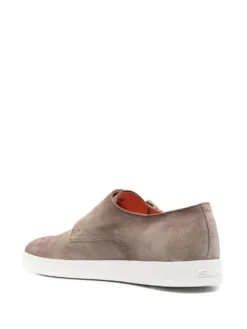 Bankable suede monk shoes from SANTONI featuring light brown, calf suede, calf leather, gold-tone buckle fastening, almond toe, branded insole and contrasting rubber sole.