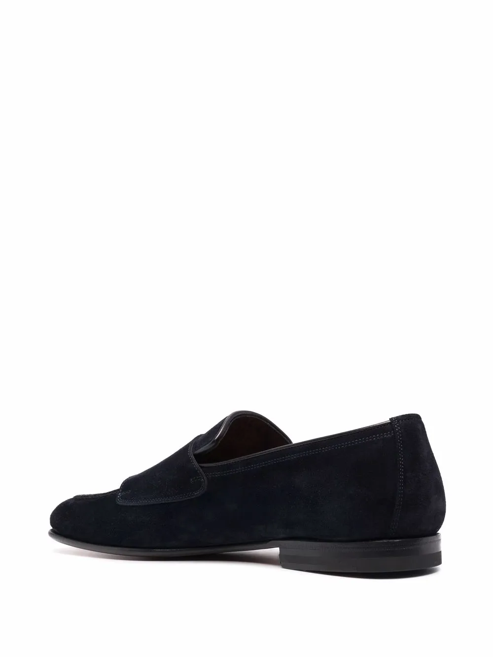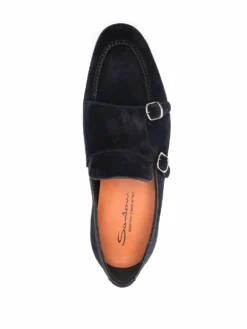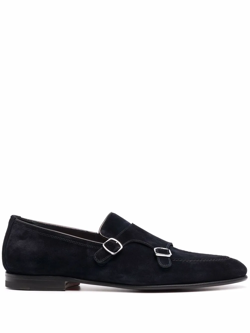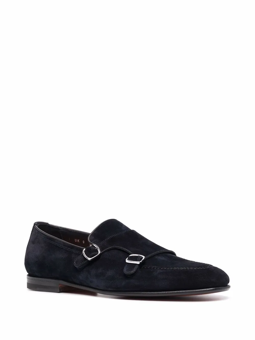 Dark blue leather buckle-detail suede shoes from SANTONI featuring slip-on style, almond toe, decorative buckle detail, branded leather insole and flat rubber sole.