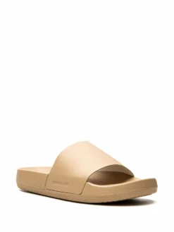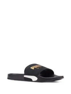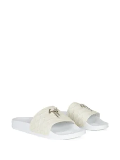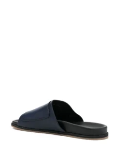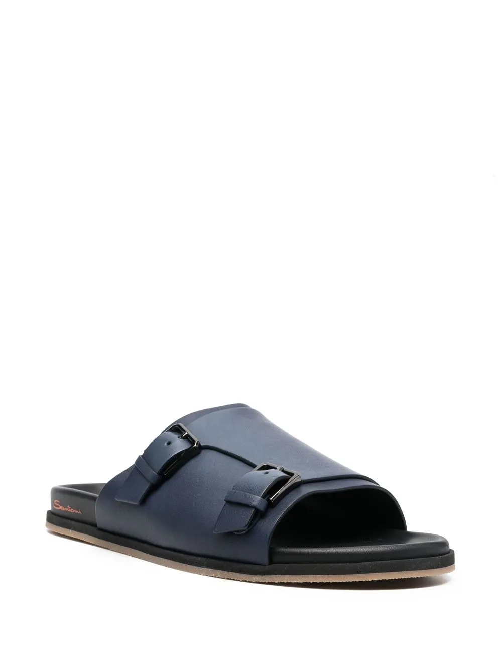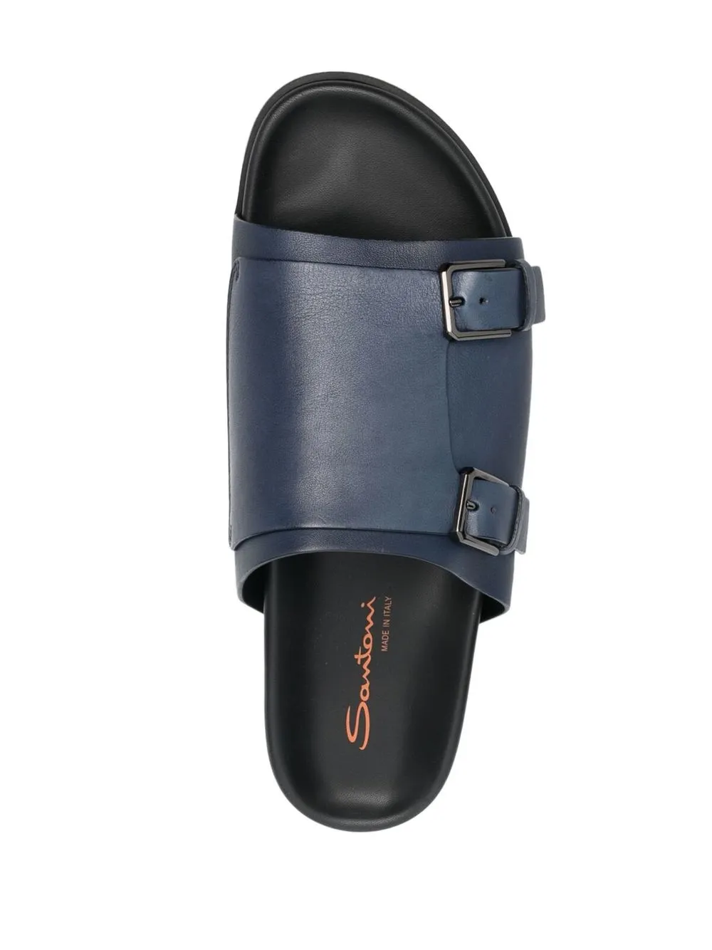 buckled leather slides from SANTONI featuring navy blue, calf leather, buckle detail at the toe, logo print to the side, open toe, almond toe, open back, slip-on style, moulded footbed, branded leather insole and flat rubber sole.