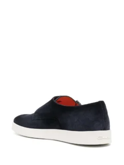 Experts in footwear, Italian brand Santoni presents a modern take on monk shoes: with a contrasting flat sole, the pair arrives in blue-hued suede upper.