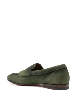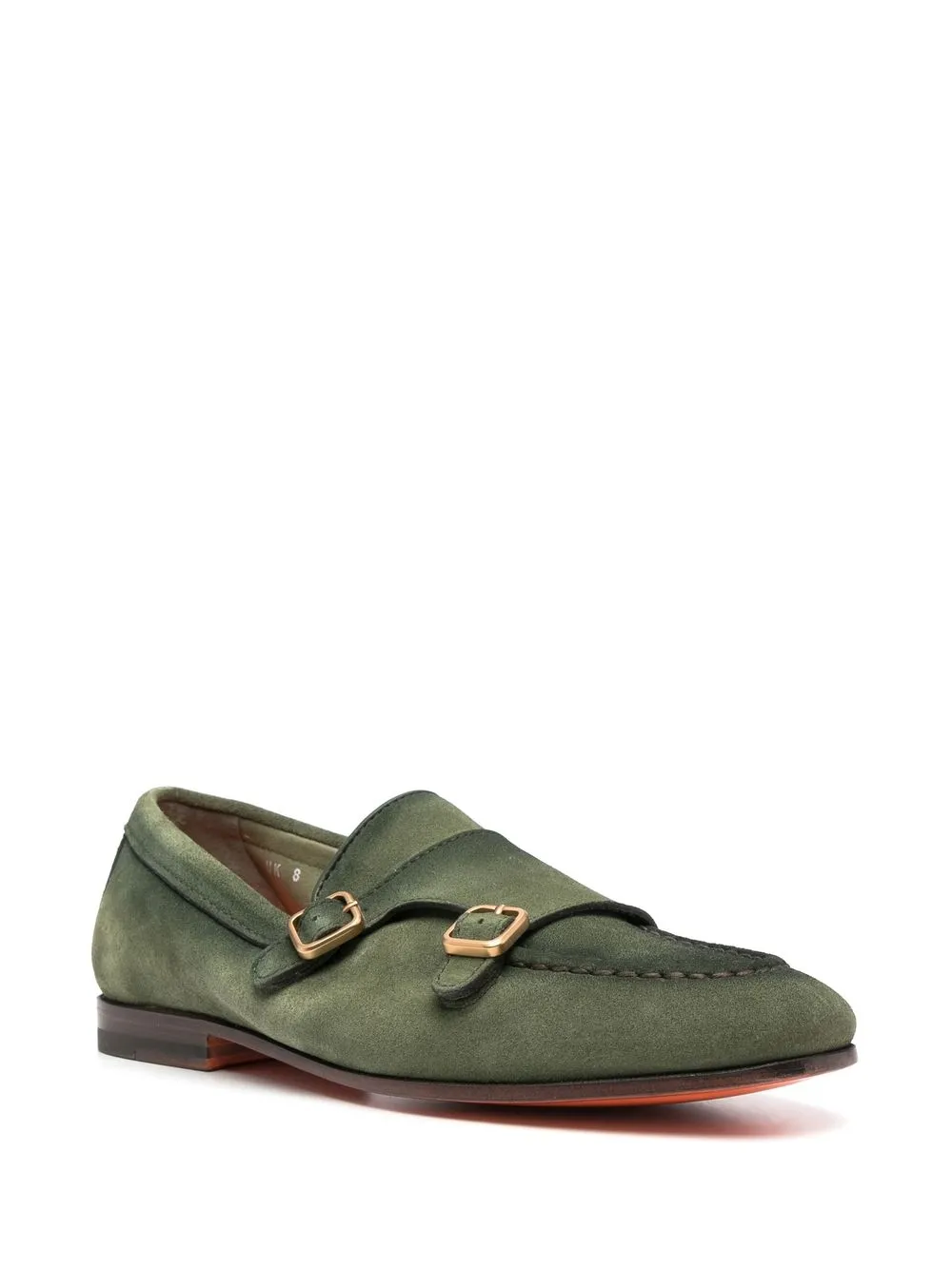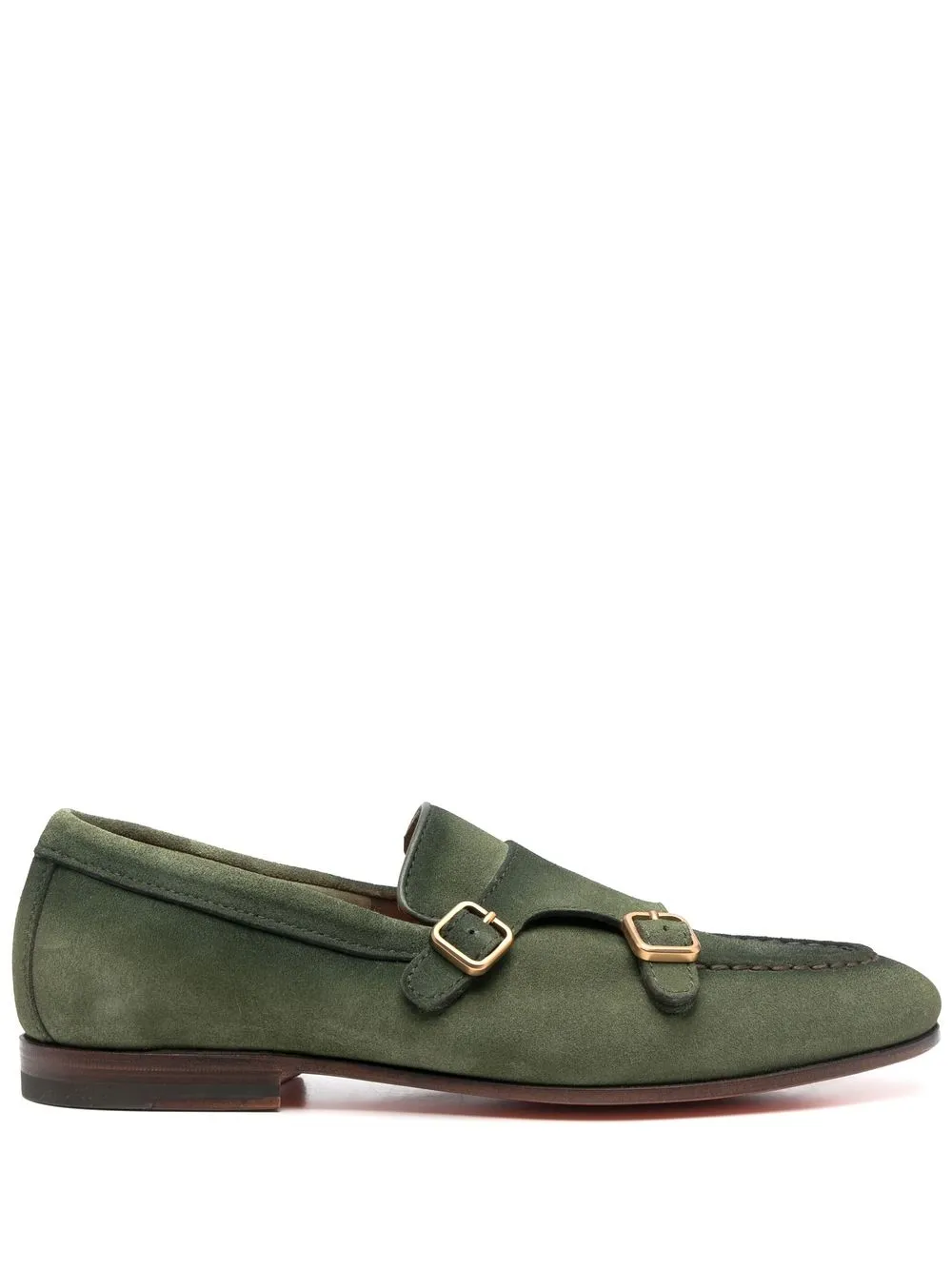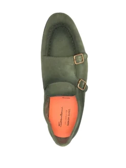 Carlos double-strap monk shoes from SANTONI featuring olive green, suede, almond toe, side buckle fastening, branded insole and flat leather sole.