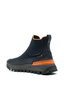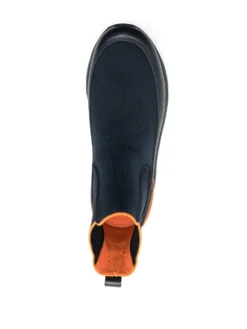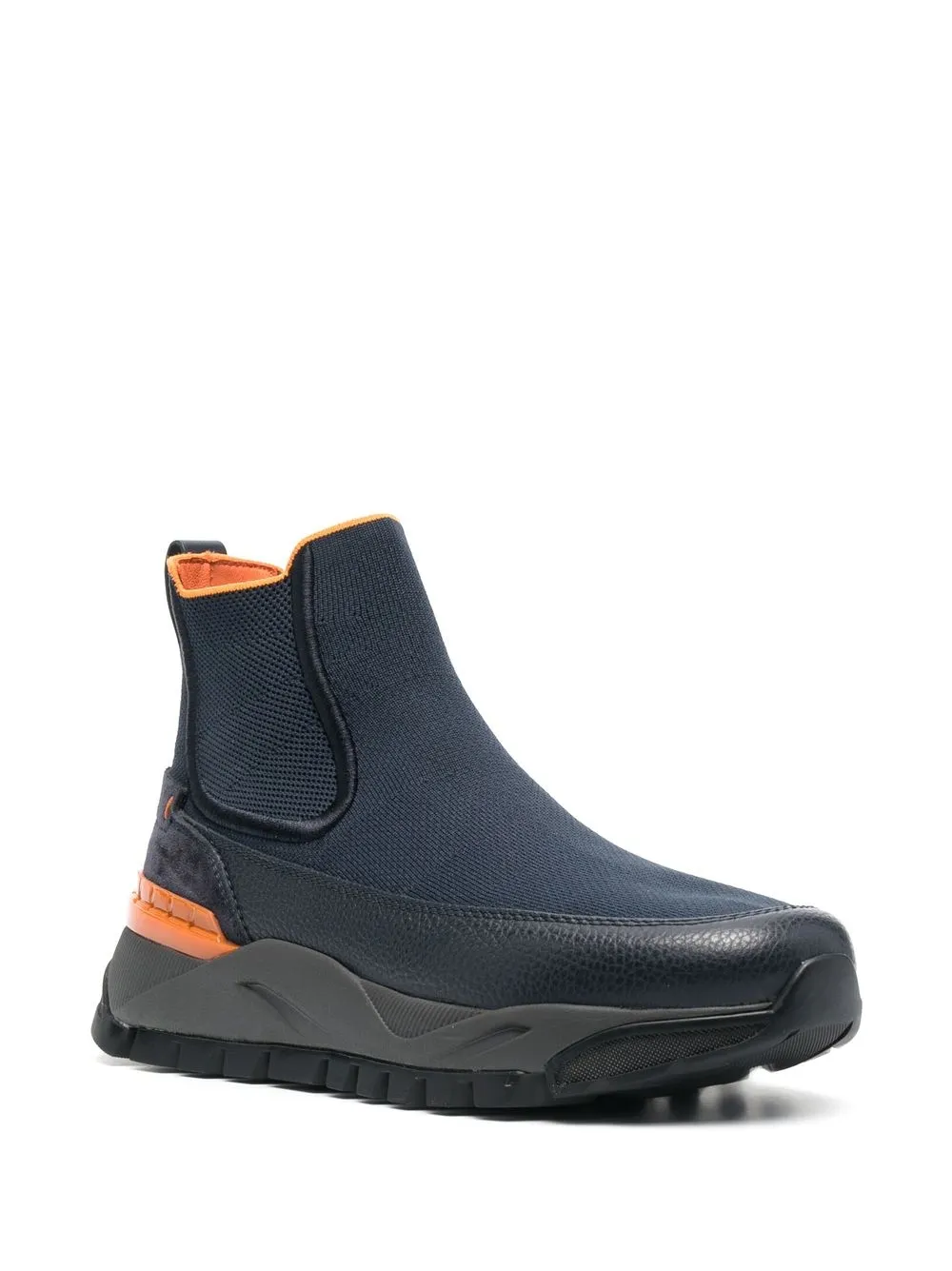 contrast-panel Chelsea boots from SANTONI featuring blue, orange, calf leather, contrasting panel detail, knitted upper, suede trim, elasticated side panels, round toe, branded leather insole, full lining, pull-tab at the heel, rubber sole and pull-on style.