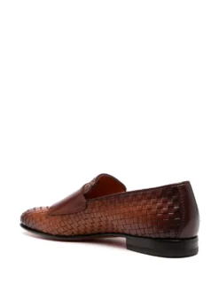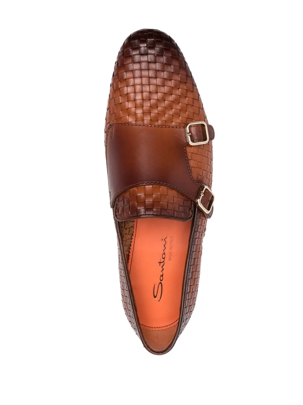 double-monk strap woven shoes from SANTONI featuring caramel brown, calf leather, interwoven design, side buckle fastening, gold-tone hardware, branded insole and flat leather sole.