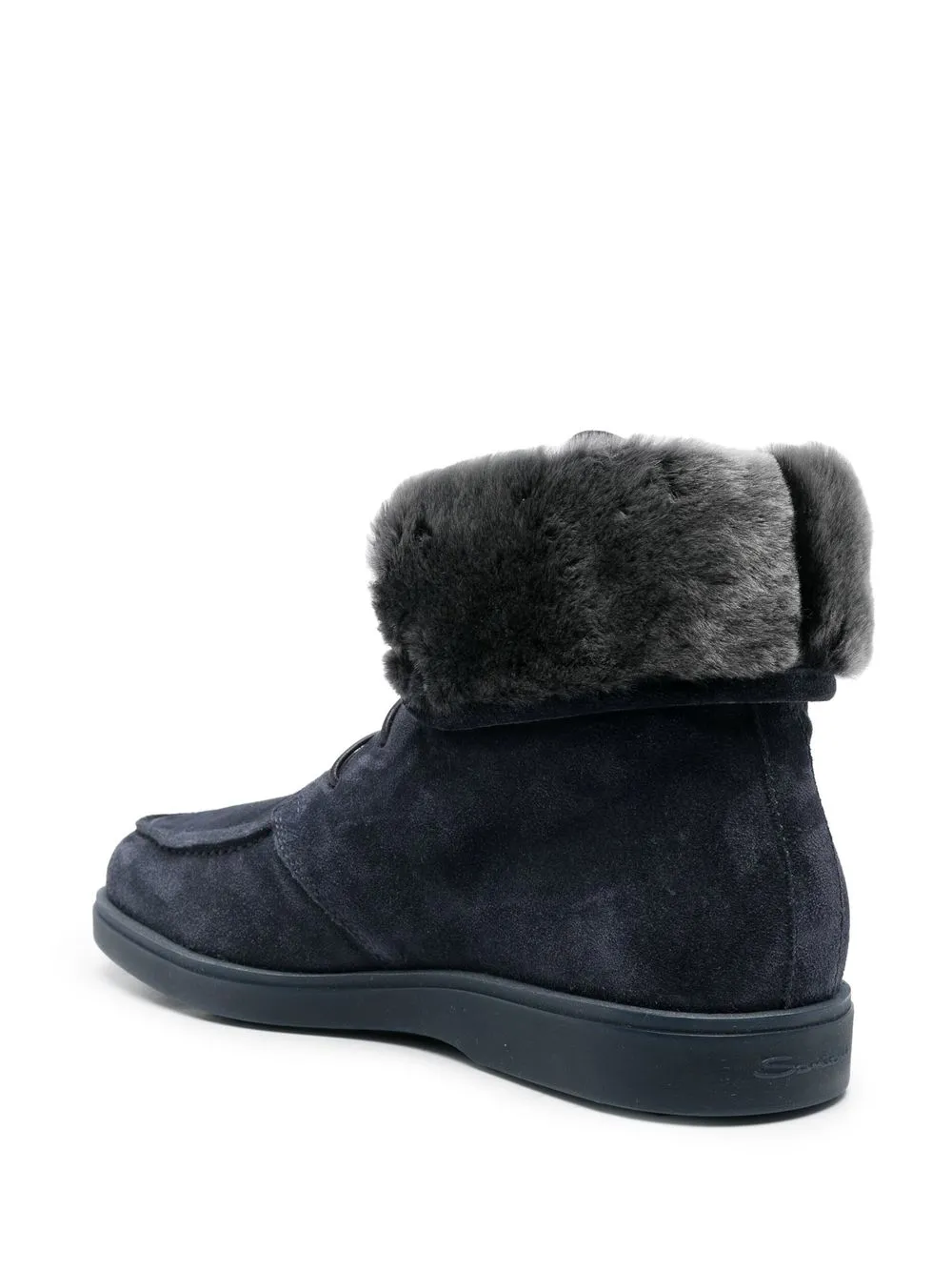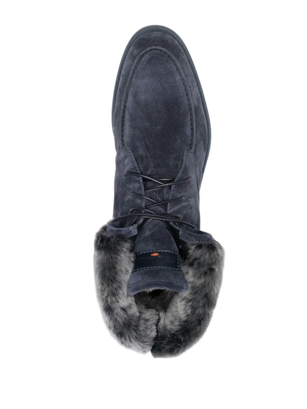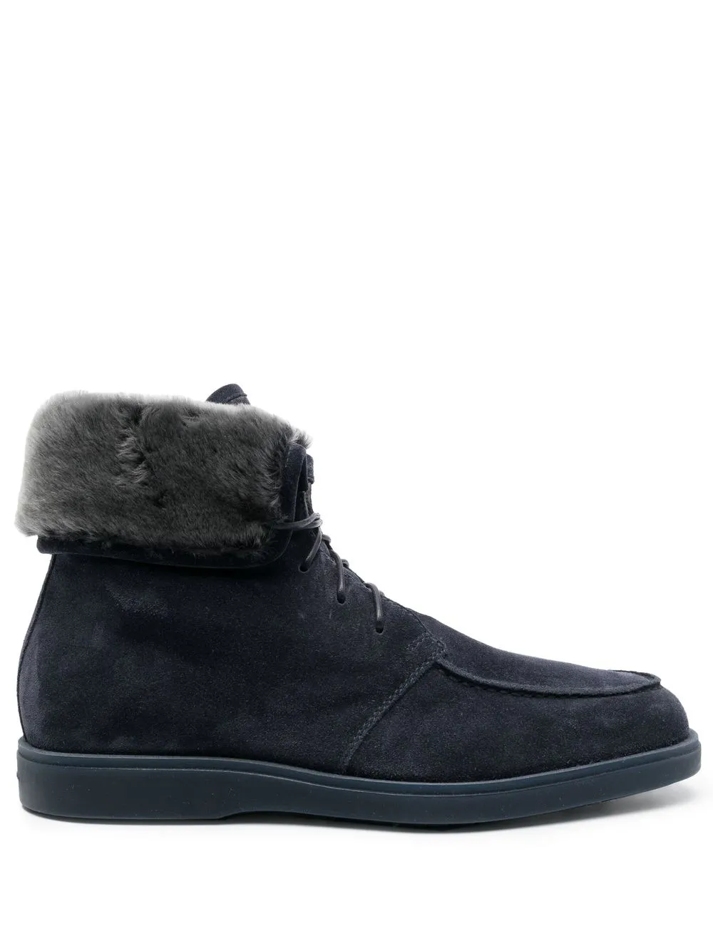faux-fur suede boots from SANTONI featuring light blue, calf leather, faux-fur detailing, almond toe, front lace-up fastening, ankle-length and flat rubber sole.