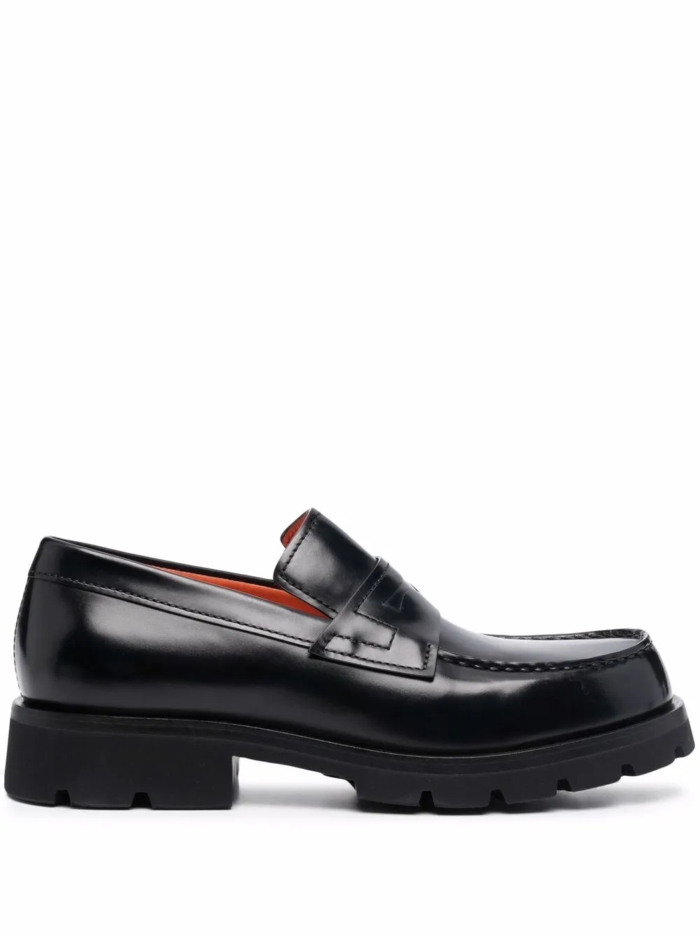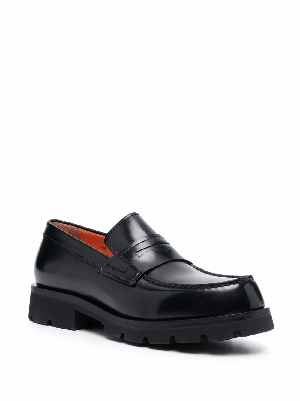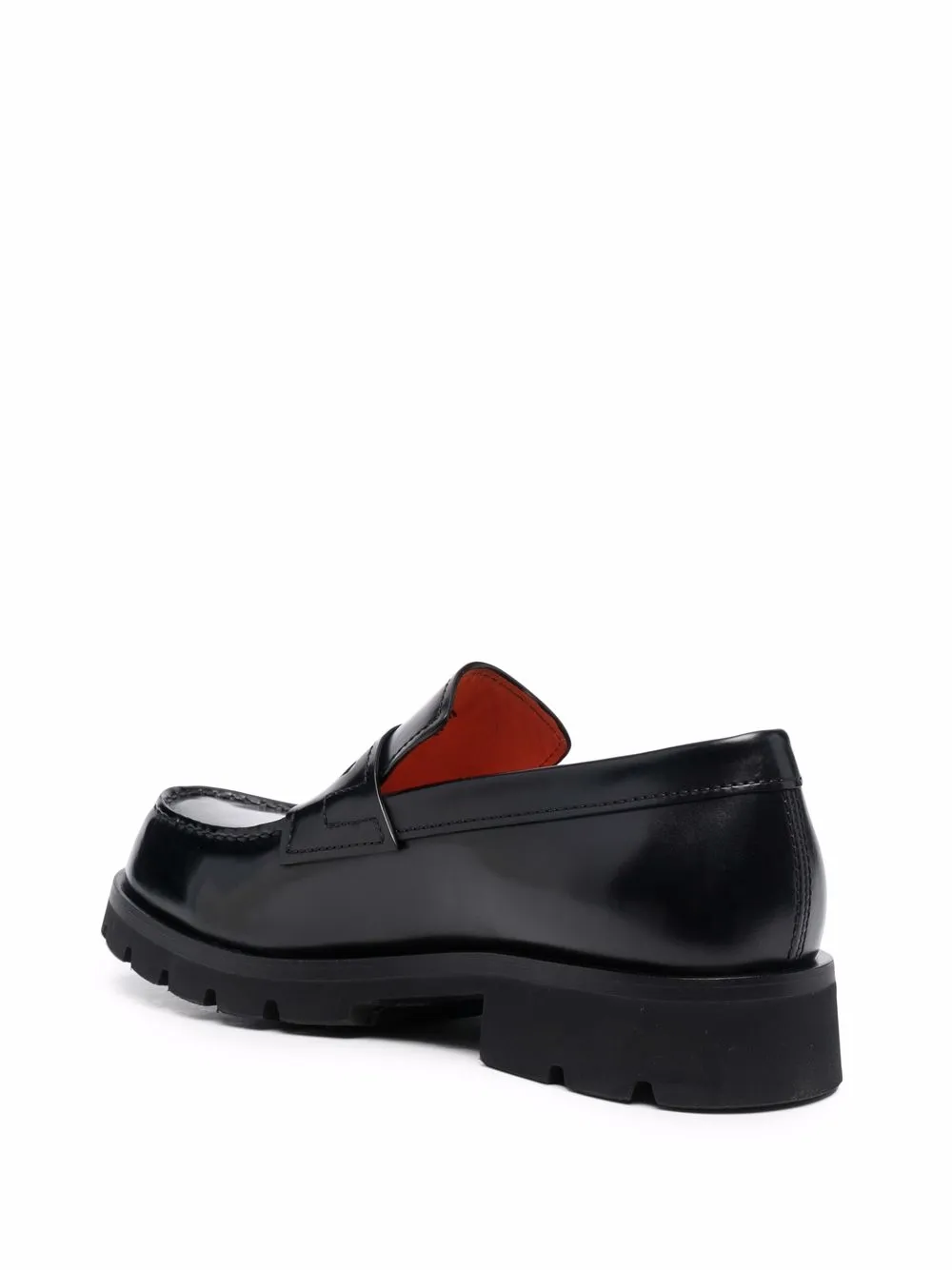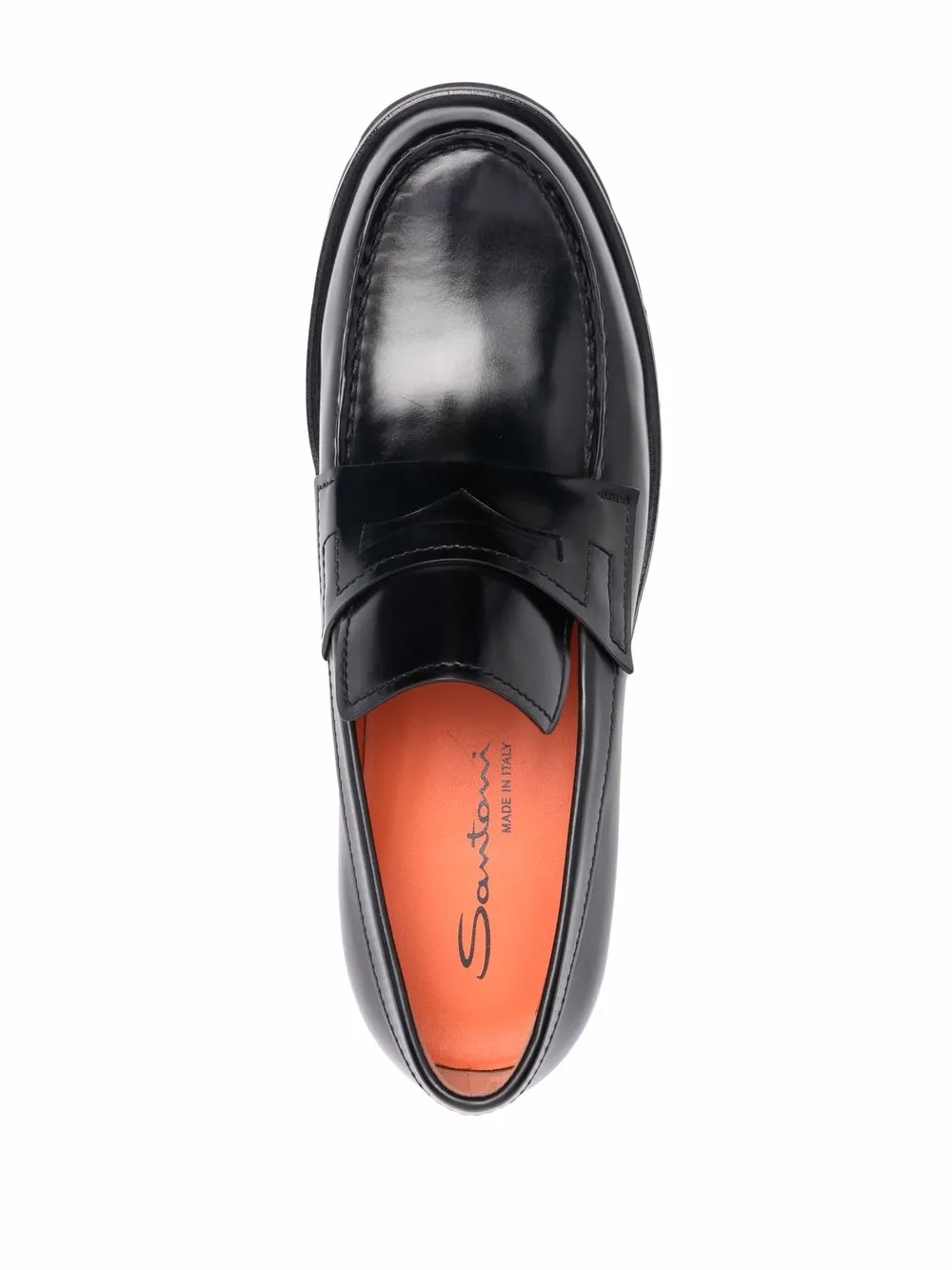 Black leather Moca penny loafers from SANTONI featuring almond toe, leather lining, branded insole and low block heel.