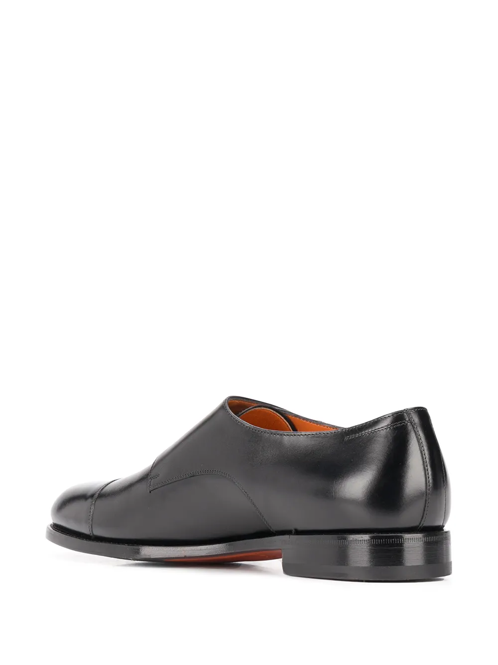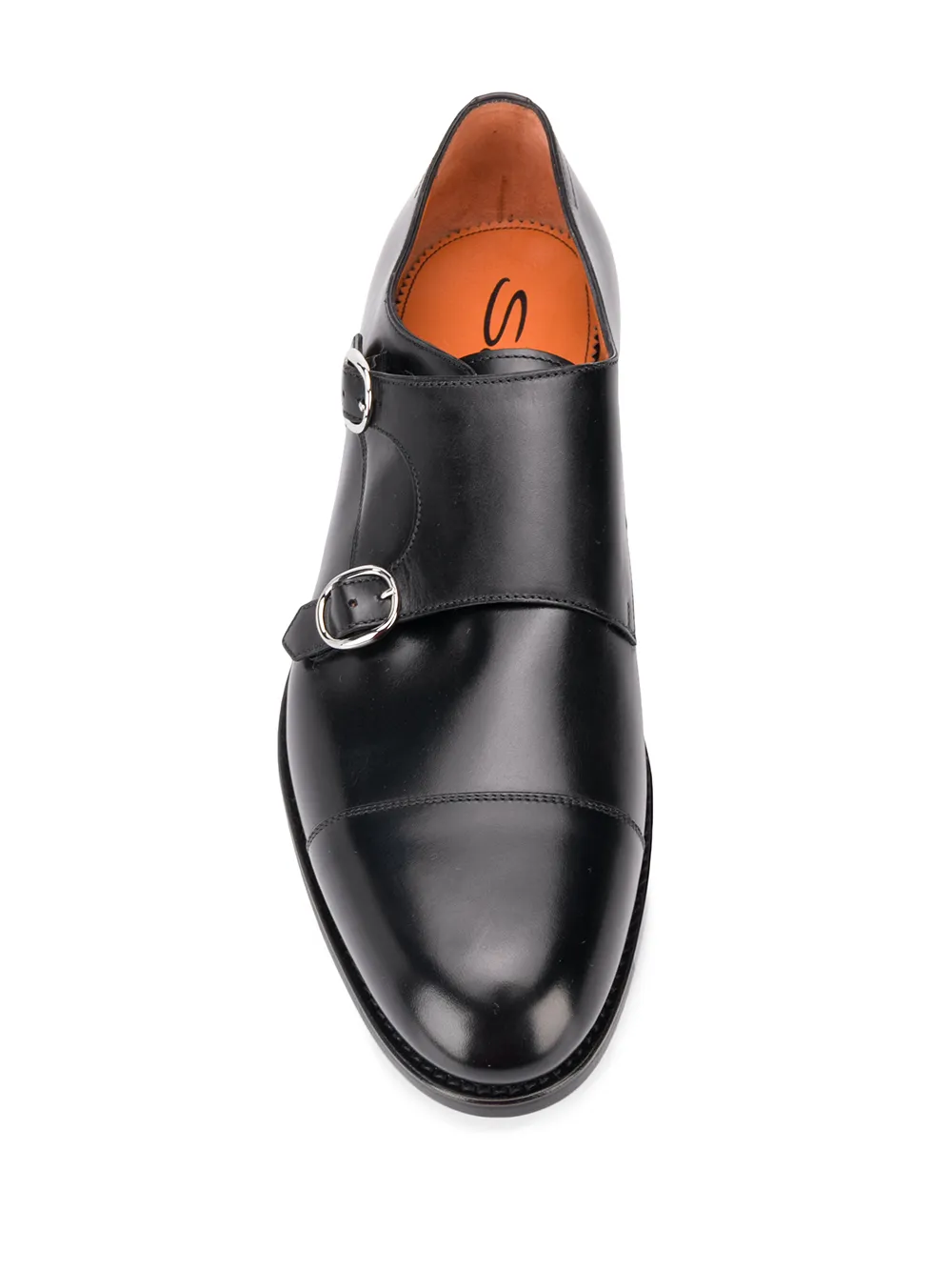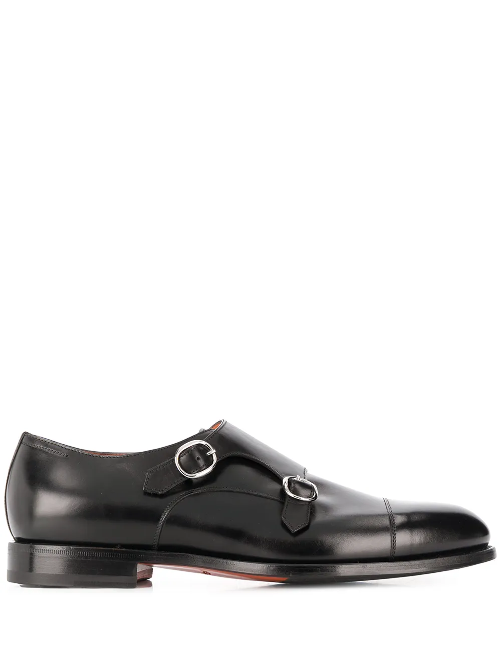 Black leather round-toe low-heel monk shoes from Santoni featuring a branded insole, a low heel, a buckle fastening and a round toe.
