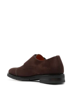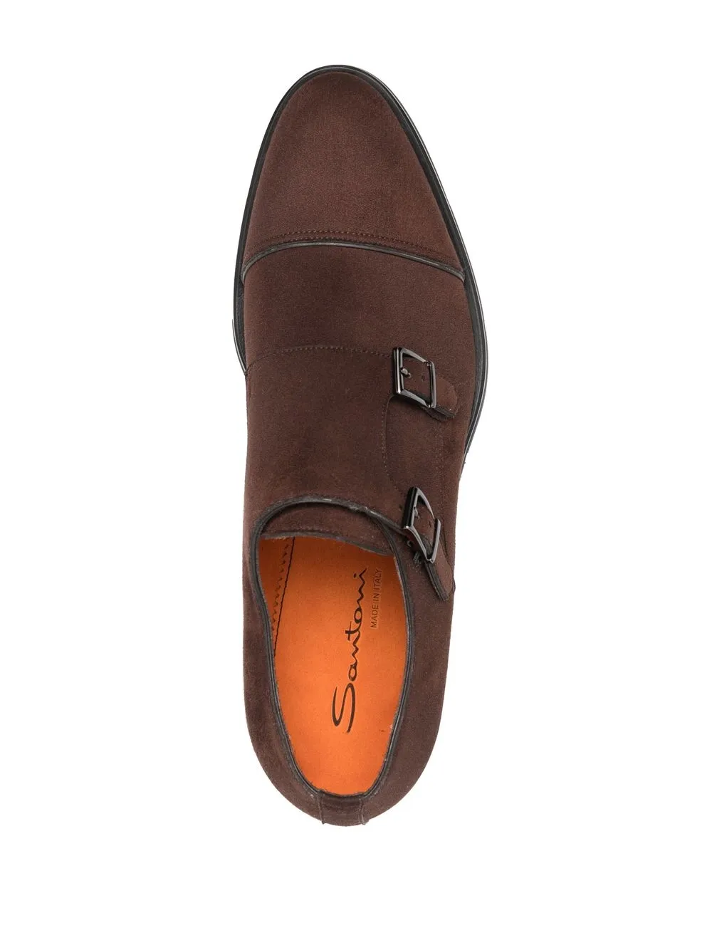 side buckle-fastening detail monk shoes from SANTONI featuring side buckle fastening, branded insole, flat rubber sole, dark brown, calf leather and round toe.