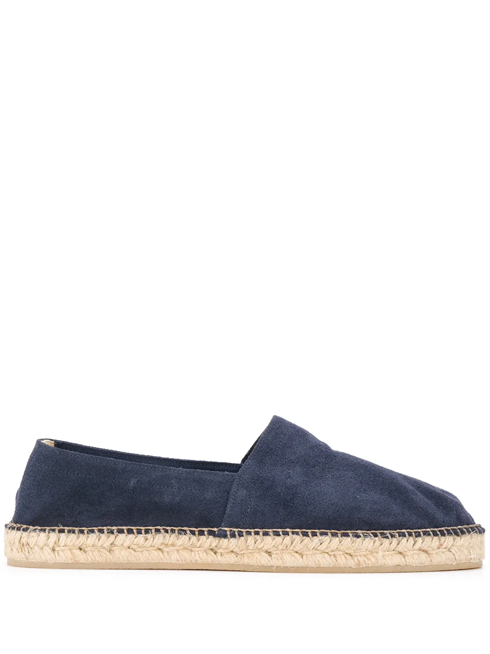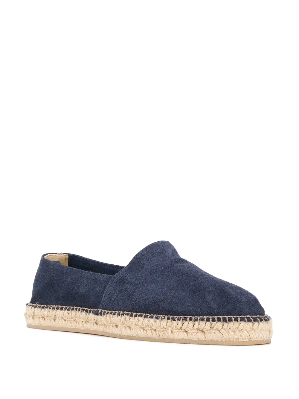 Dark blue suede Pablo plain espadrilles from Scarosso featuring round toe, slip-on style, branded insole and braided raffia sole.