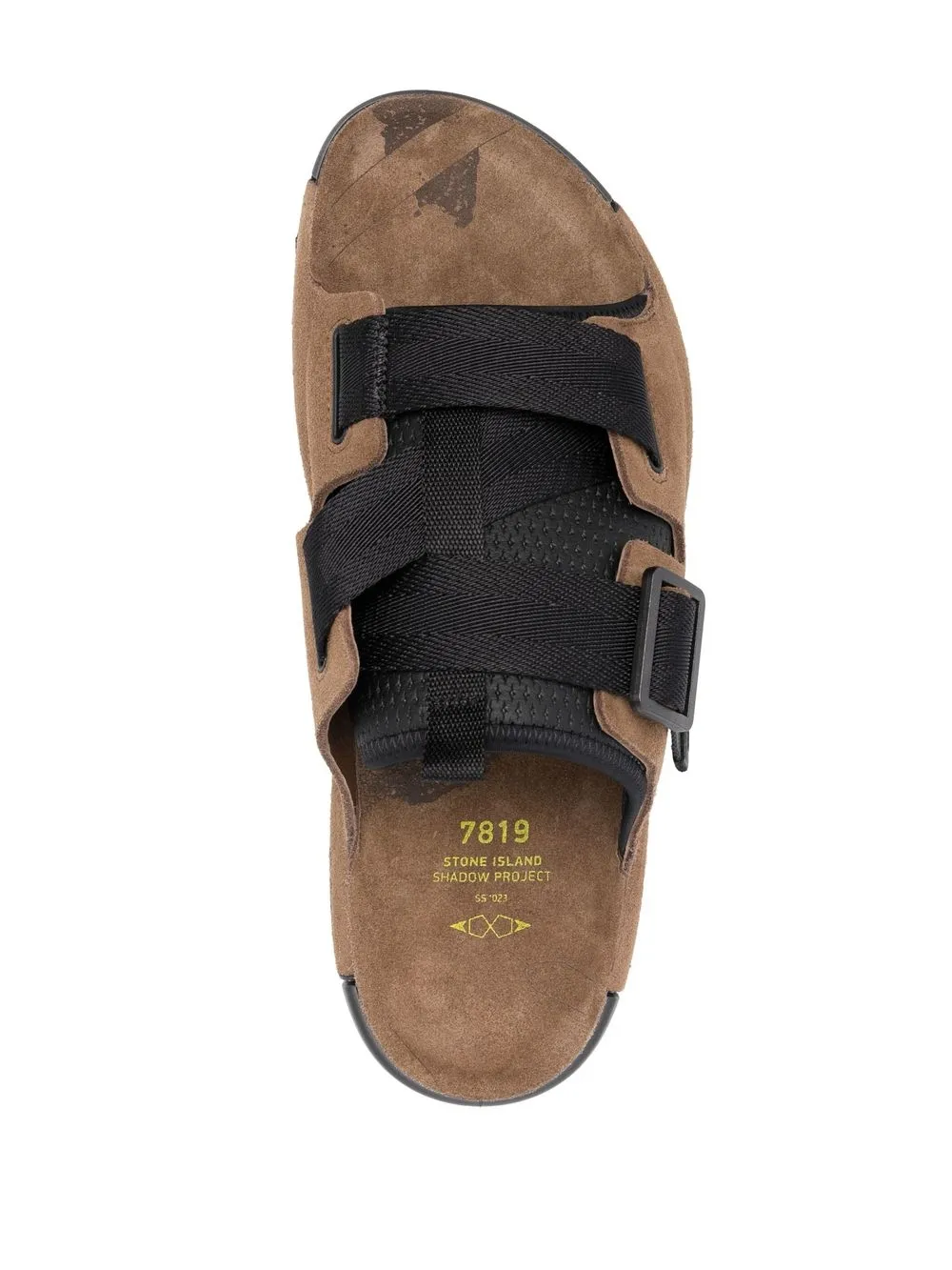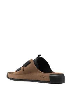 crossover fastening suede slides from STONE ISLAND SHADOW PROJECT featuring brown, calf leather, slip-on style, crossover strap detail, branded insole and flat rubber sole.