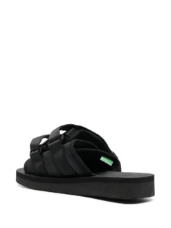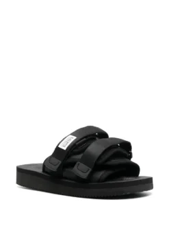 Moto-Cab touch-strap sandals from SUICOKE featuring black, logo patch to the side, branded insole, moulded footbed, front touch-strap fastening, flat rubber sole and slip-on style.