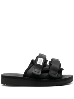 Moto-Cab touch-strap sandals from SUICOKE featuring black, logo patch to the side, branded insole, moulded footbed, front touch-strap fastening, flat rubber sole and slip-on style.