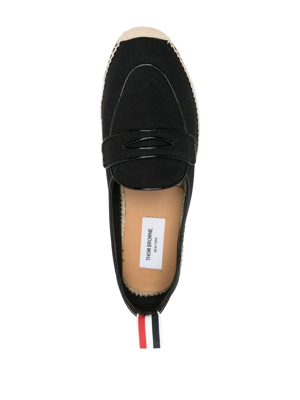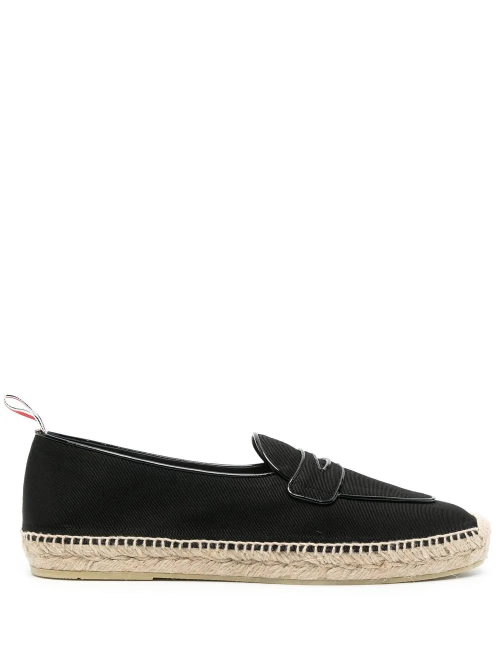 Penny cotton espadrilles from THOM BROWNE featuring black, cotton, calf leather, branded leather insole, round toe, slip-on style and braided raffia sole.