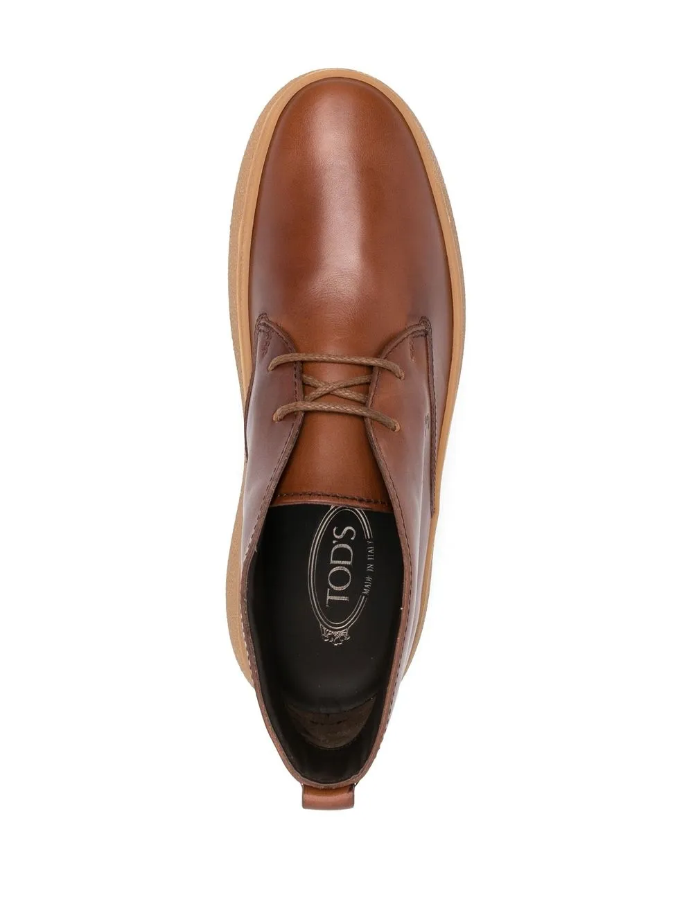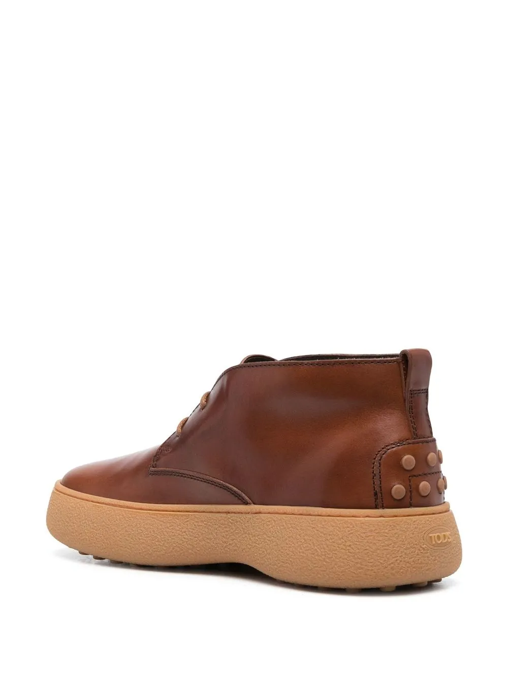 lace-up desert boots from TOD’S featuring auburn brown, calf leather, round toe, front lace-up fastening, branded insole, pull-tab at the heel and signature Gommino sole.