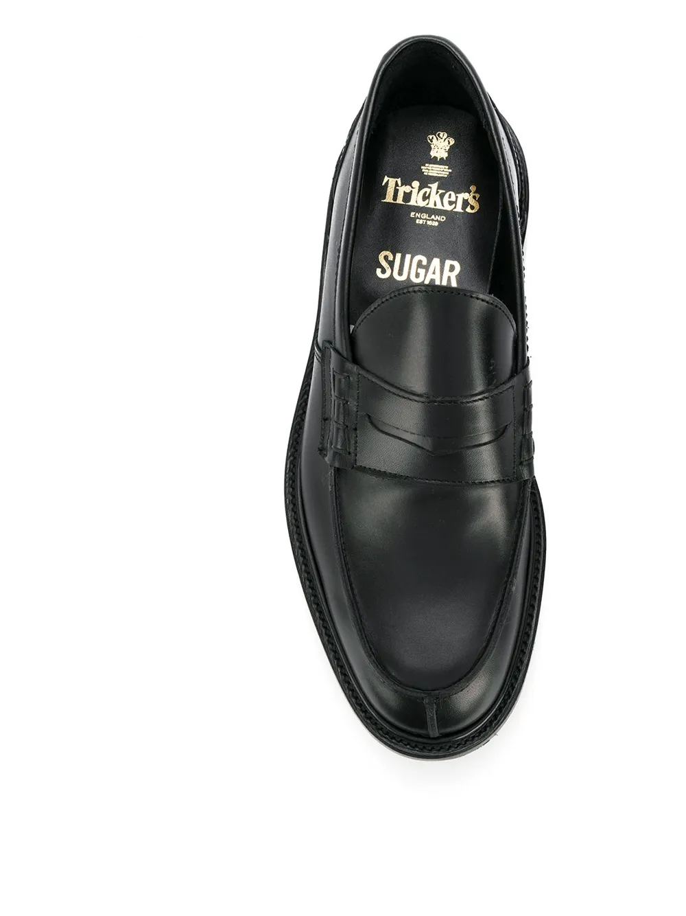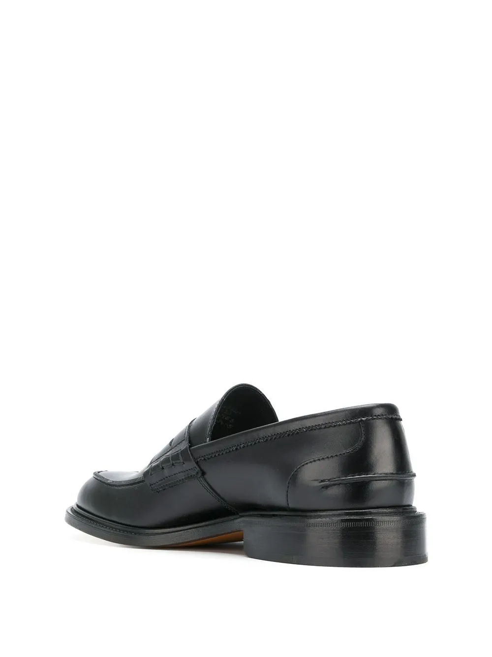 Black leather James penny loafers from Tricker’s featuring an almond toe, a branded insole and a stacked heel.