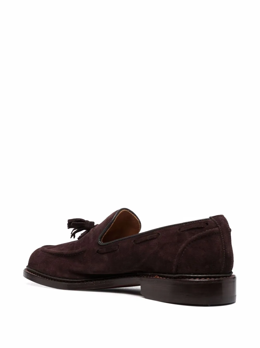 Coffee brown suede tassel-detail loafers from Tricker’s featuring tassel detail, round toe, branded insole and flat sole.