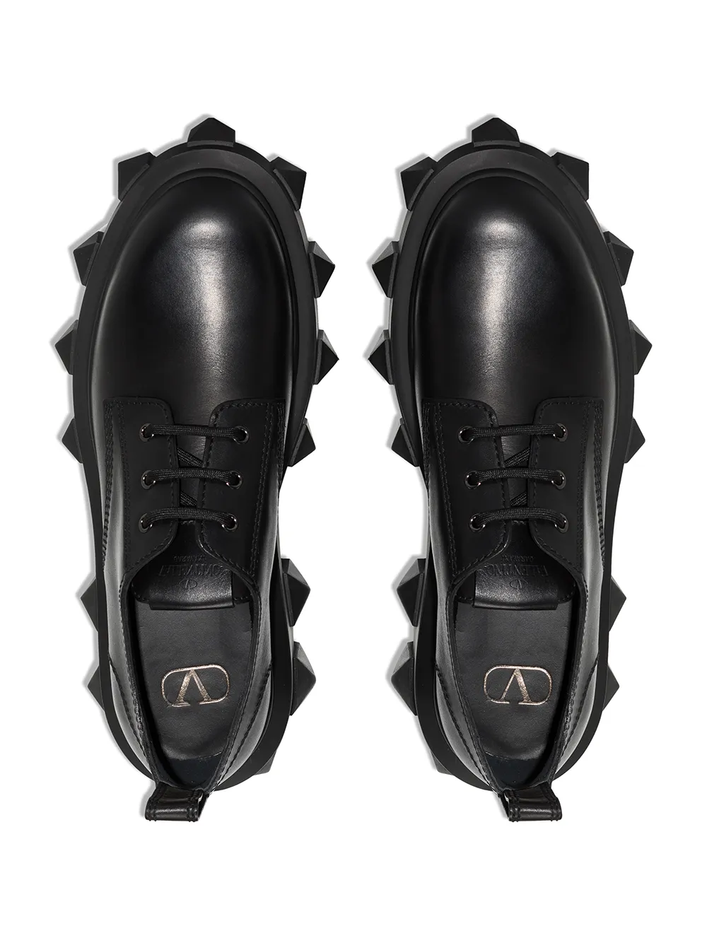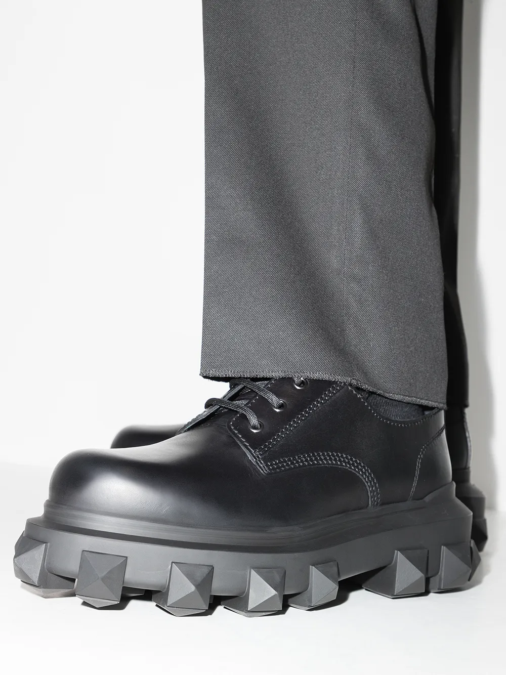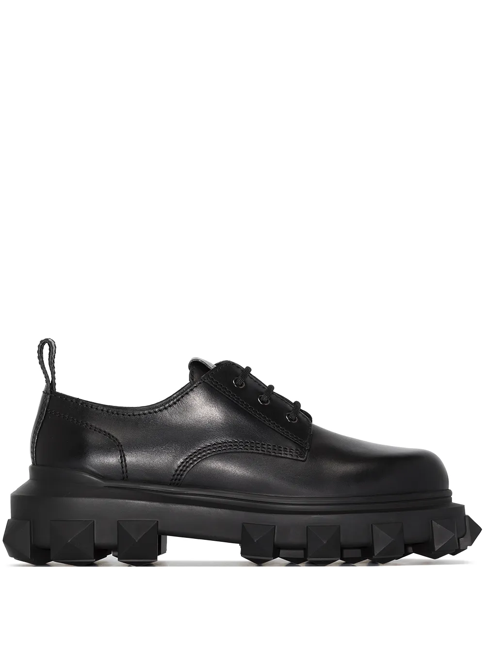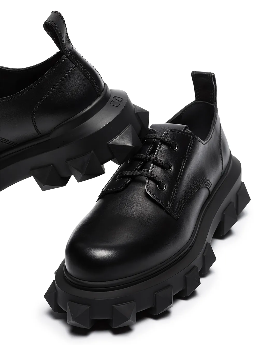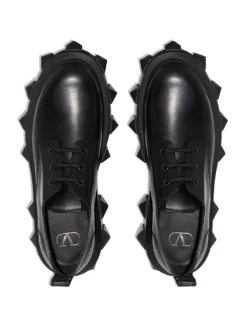 Valentino Garavani pushes boundaries and finds an innovative way to use its signature Roman stud detailing. Crafted from leather, these derby shoes sit atop an oversized lug sole, accented with the signature detail in a tonal design.