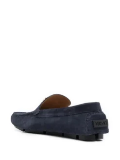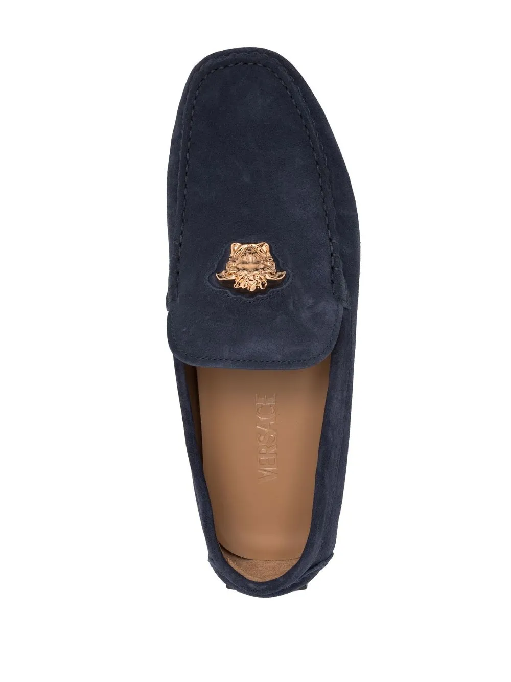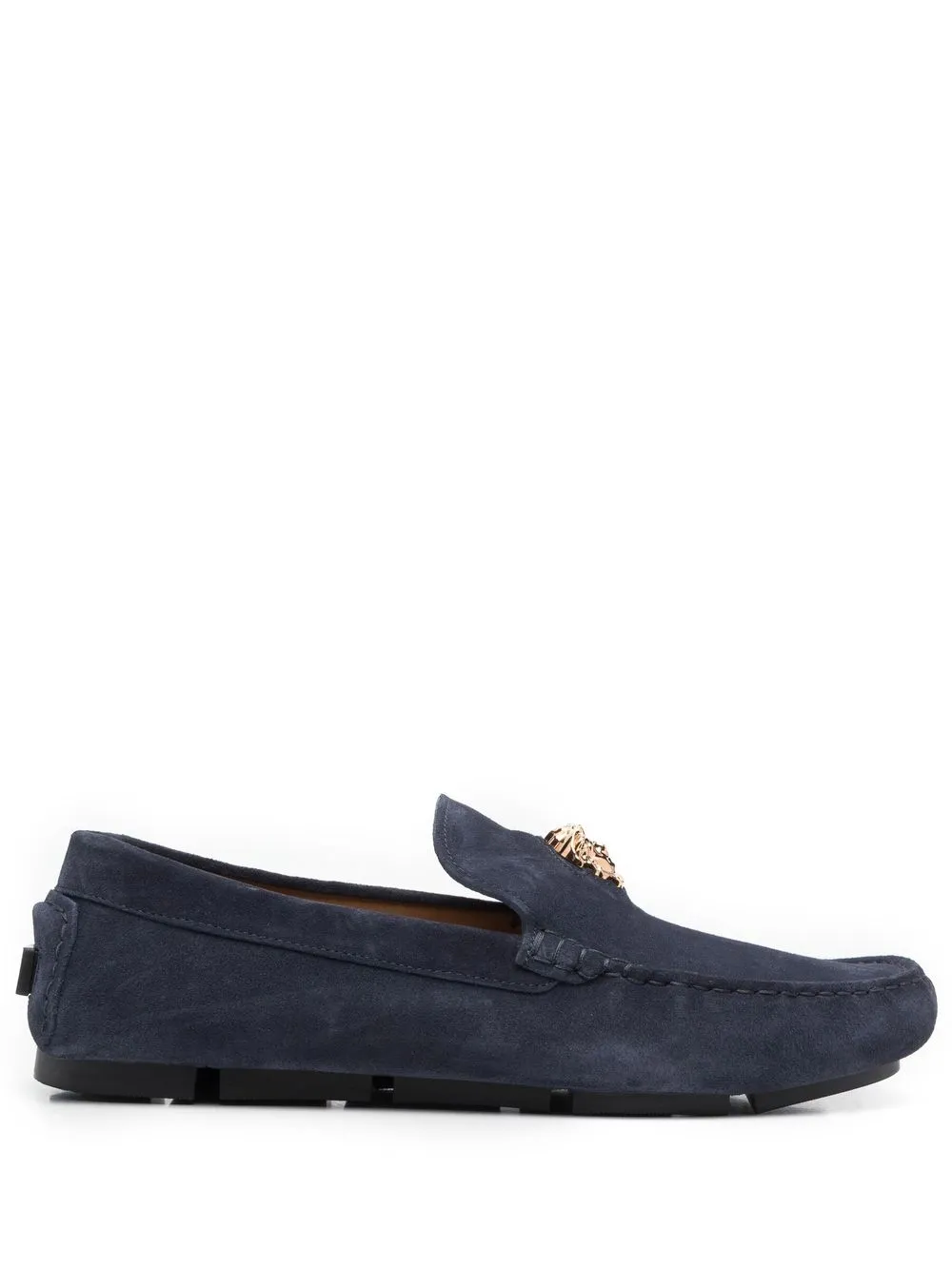 Medusa plaque loafers from VERSACE featuring navy blue, leather, Medusa plaque detail, gold-tone hardware, slip-on style, round toe and flat rubber sole.