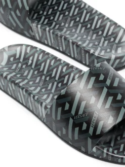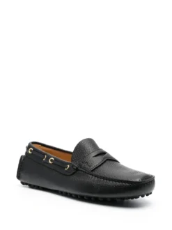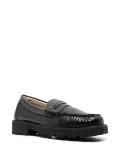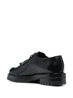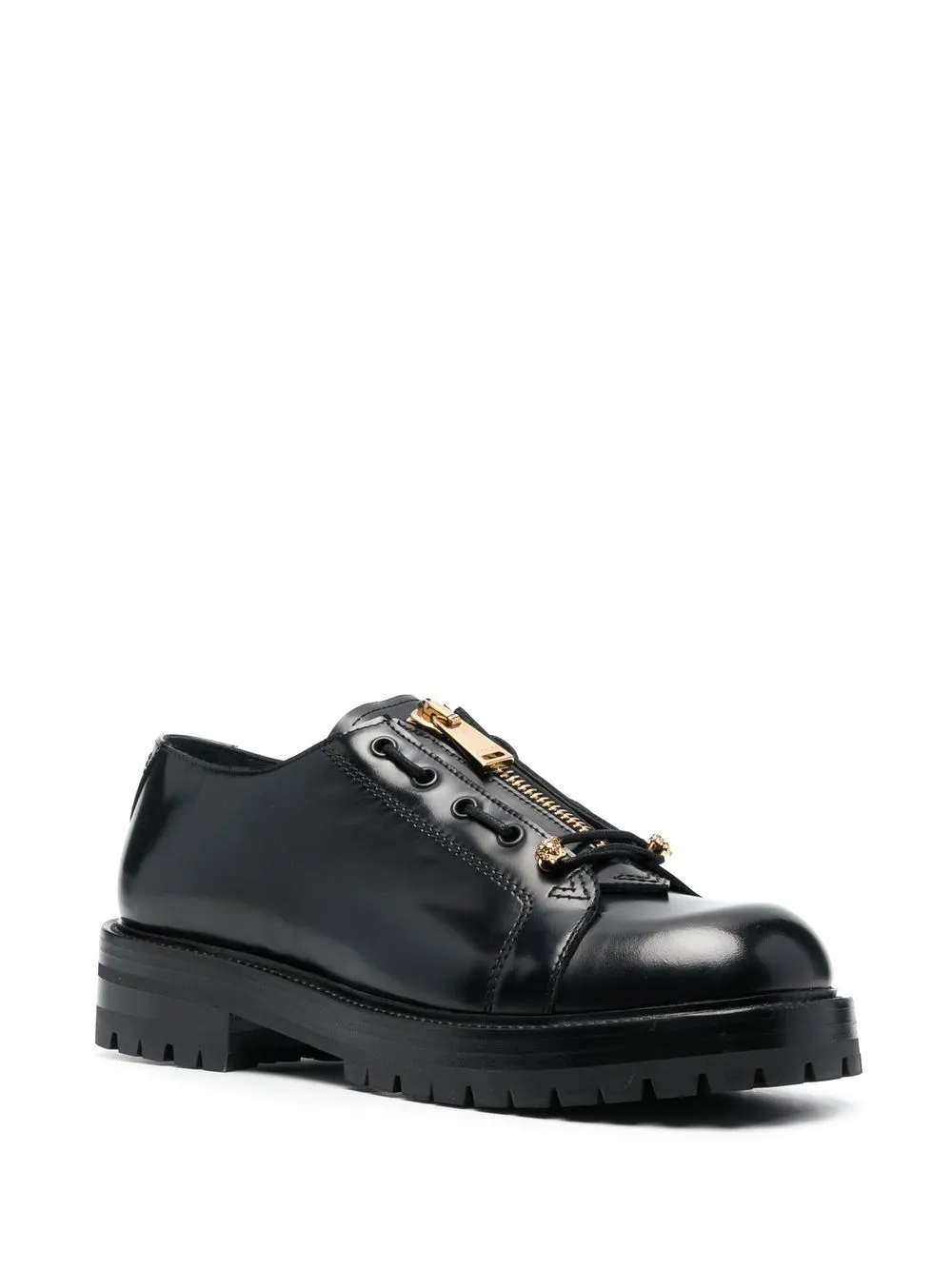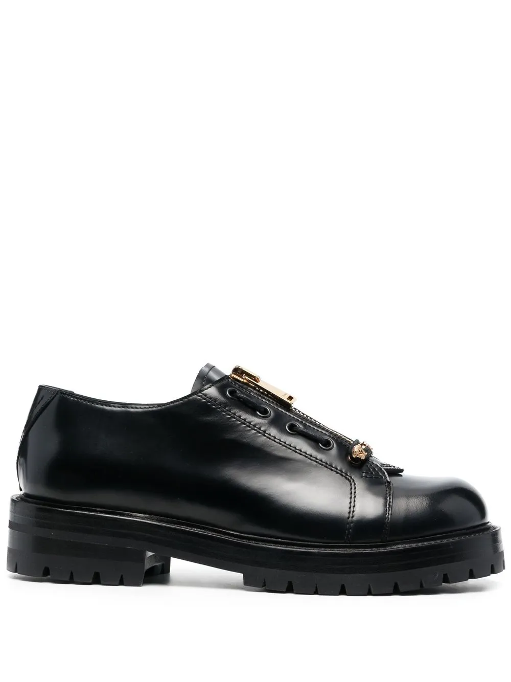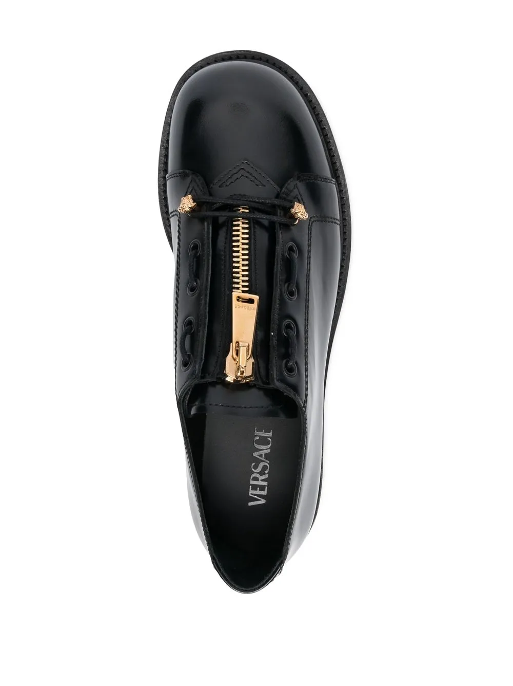 zip-detail round-toe loafers from Versace featuring black, calf leather, gold-tone hardware, Medusa plaque detail, front zip fastening, faux lace-up design, round toe, flat rubber sole and low block heel.