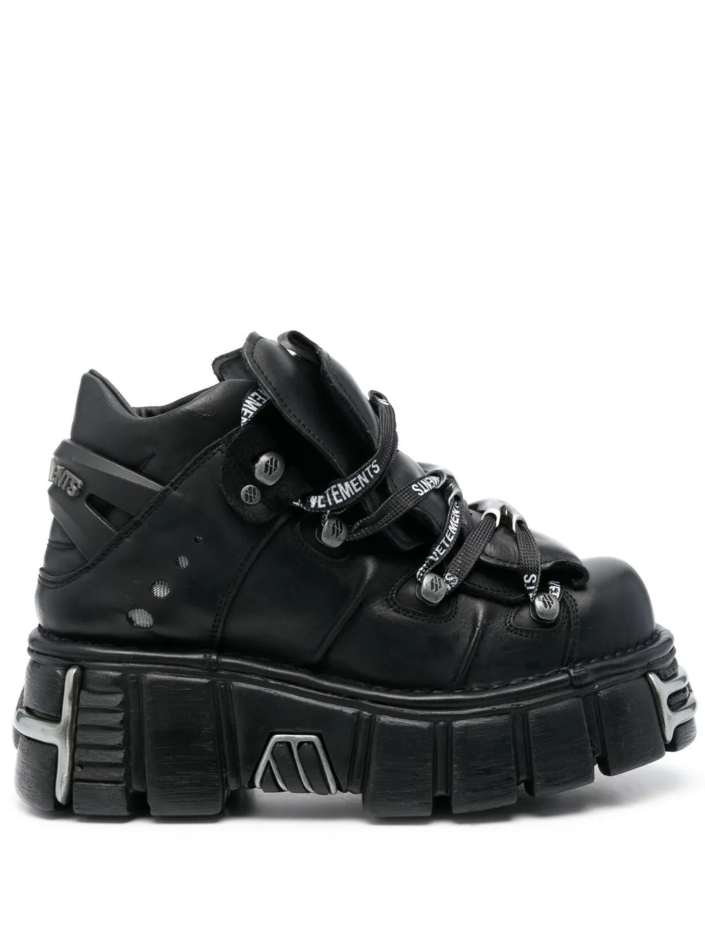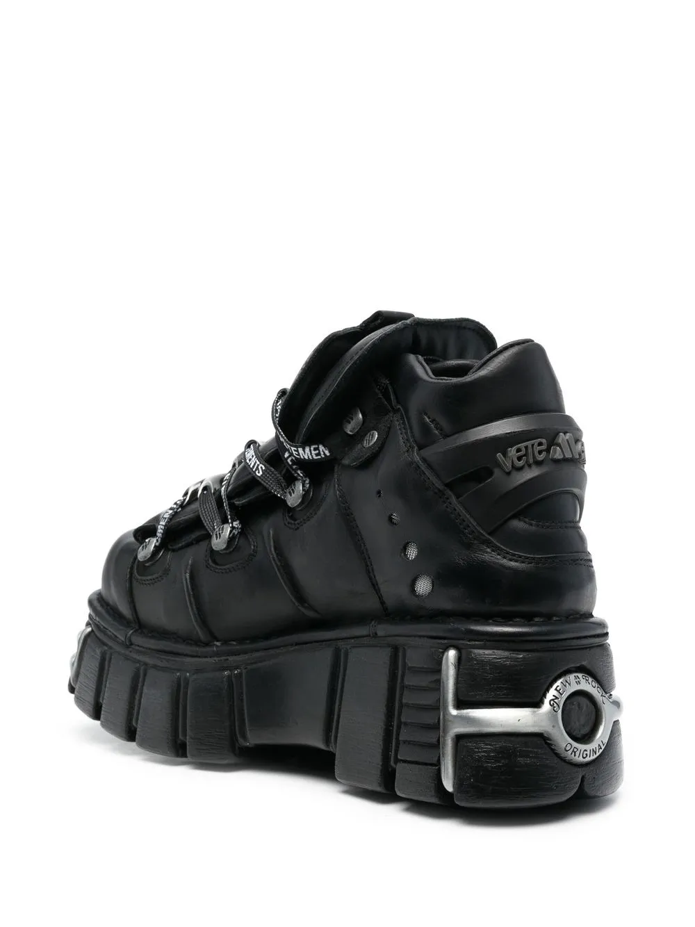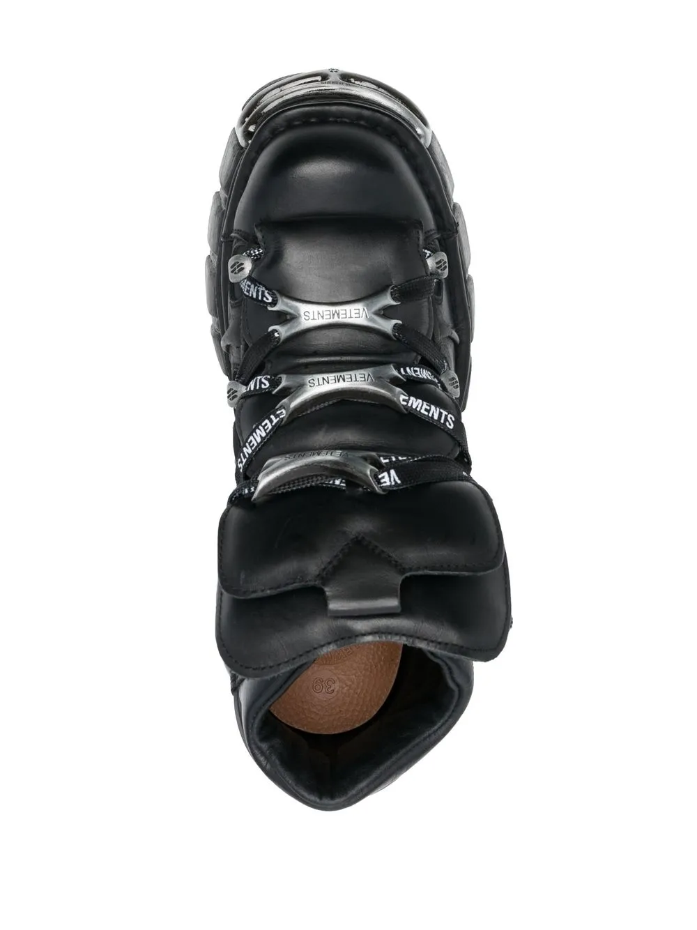 panelled lace-up chunky boots from Vetements featuring black, calf leather, panelled design, front lace-up fastening, round toe and chunky rubber lug sole.