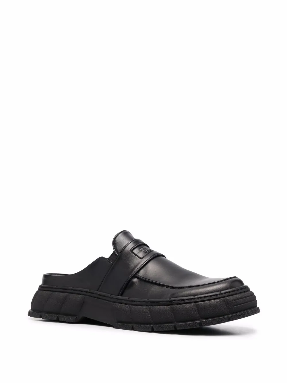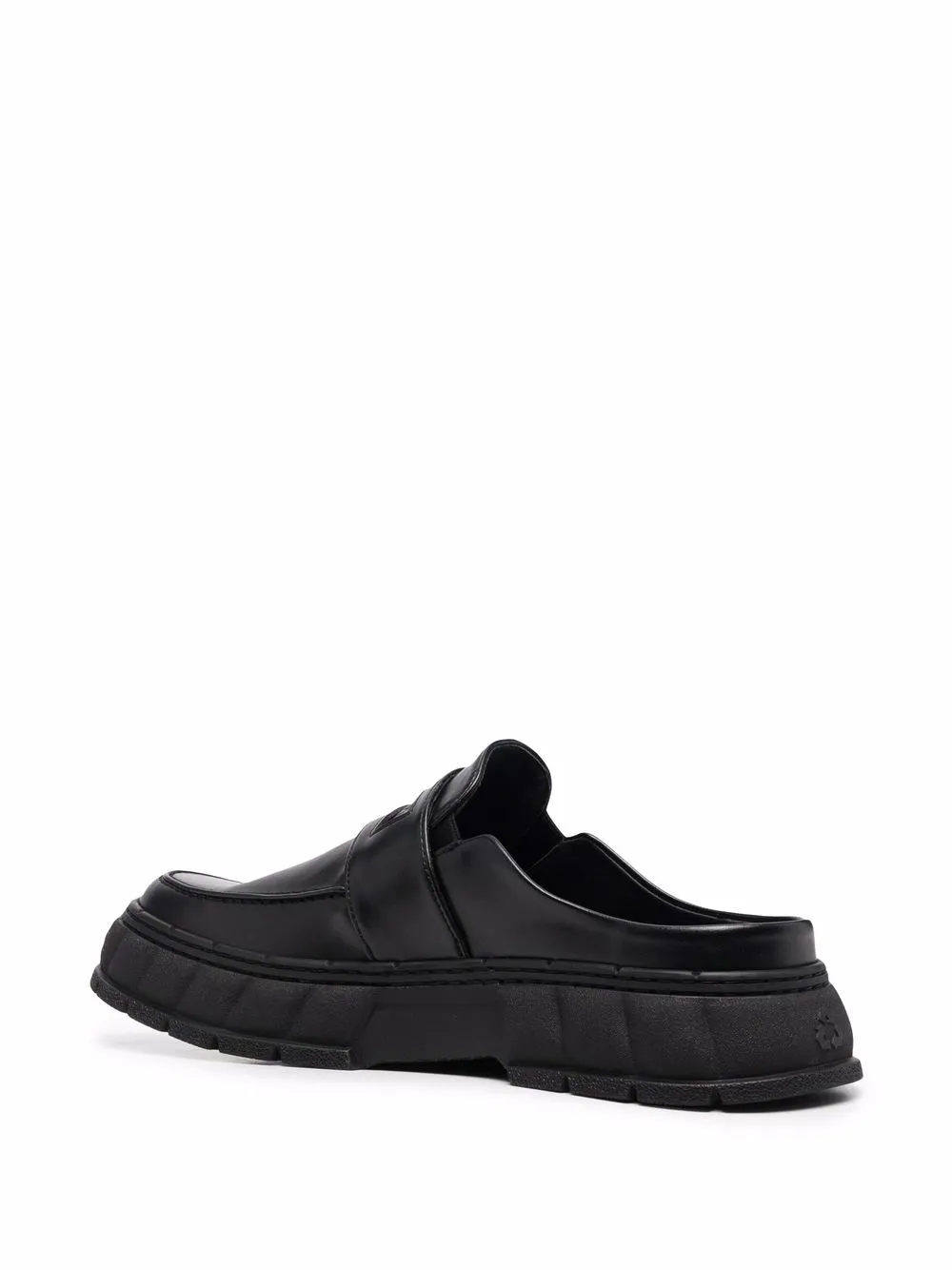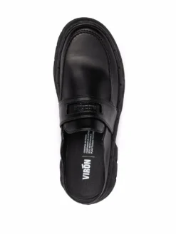 Black apple leather backless chunky-sole loafers from Virón featuring slip-on style, embossed logo to the front, round toe, open back and chunky rubber sole. POSITIVELY CONSCIOUS: This Animal Conscious product is constructed from vegan leather, so you can be confident that you are helping to support animal welfare. Please consider that many vegan leathers are made of synthetic, non-recycled and non-biodegradable materials..