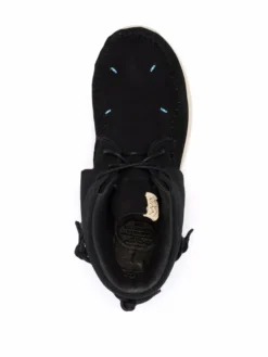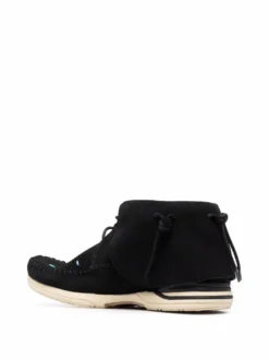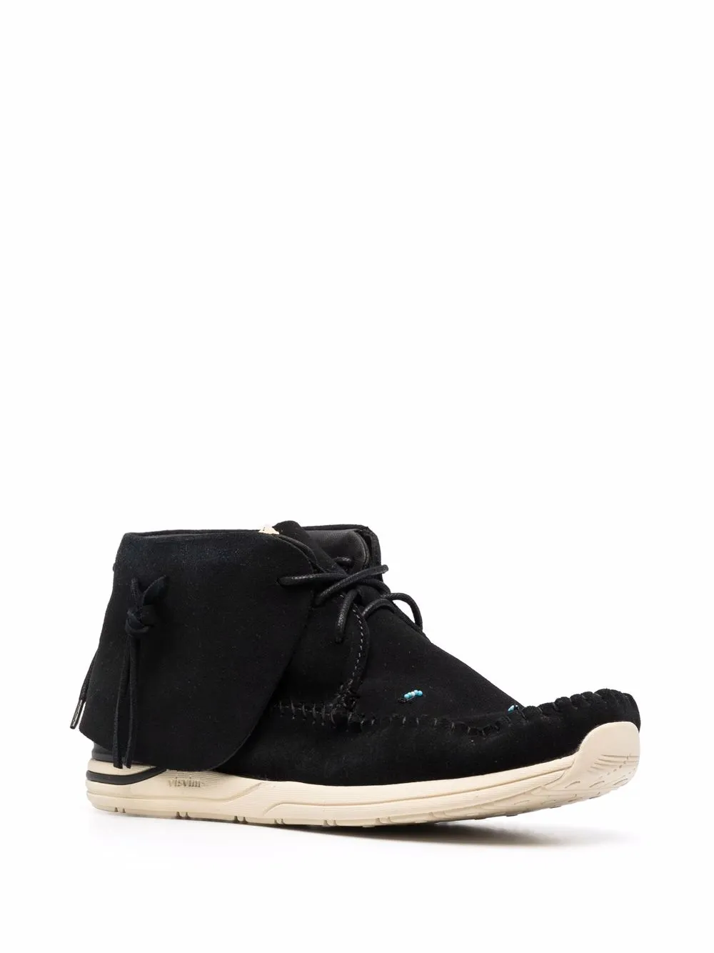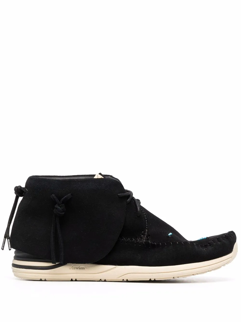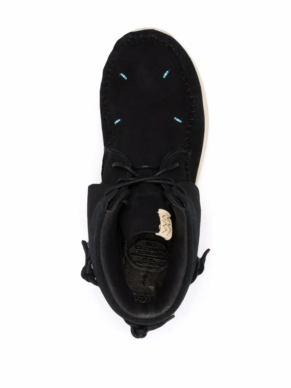 Black suede foldover moccasin boots from visvim featuring contrast stitching, round toe, front lace-up fastening and ridged rubber sole.
