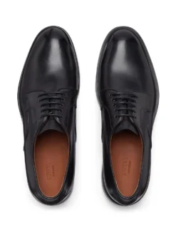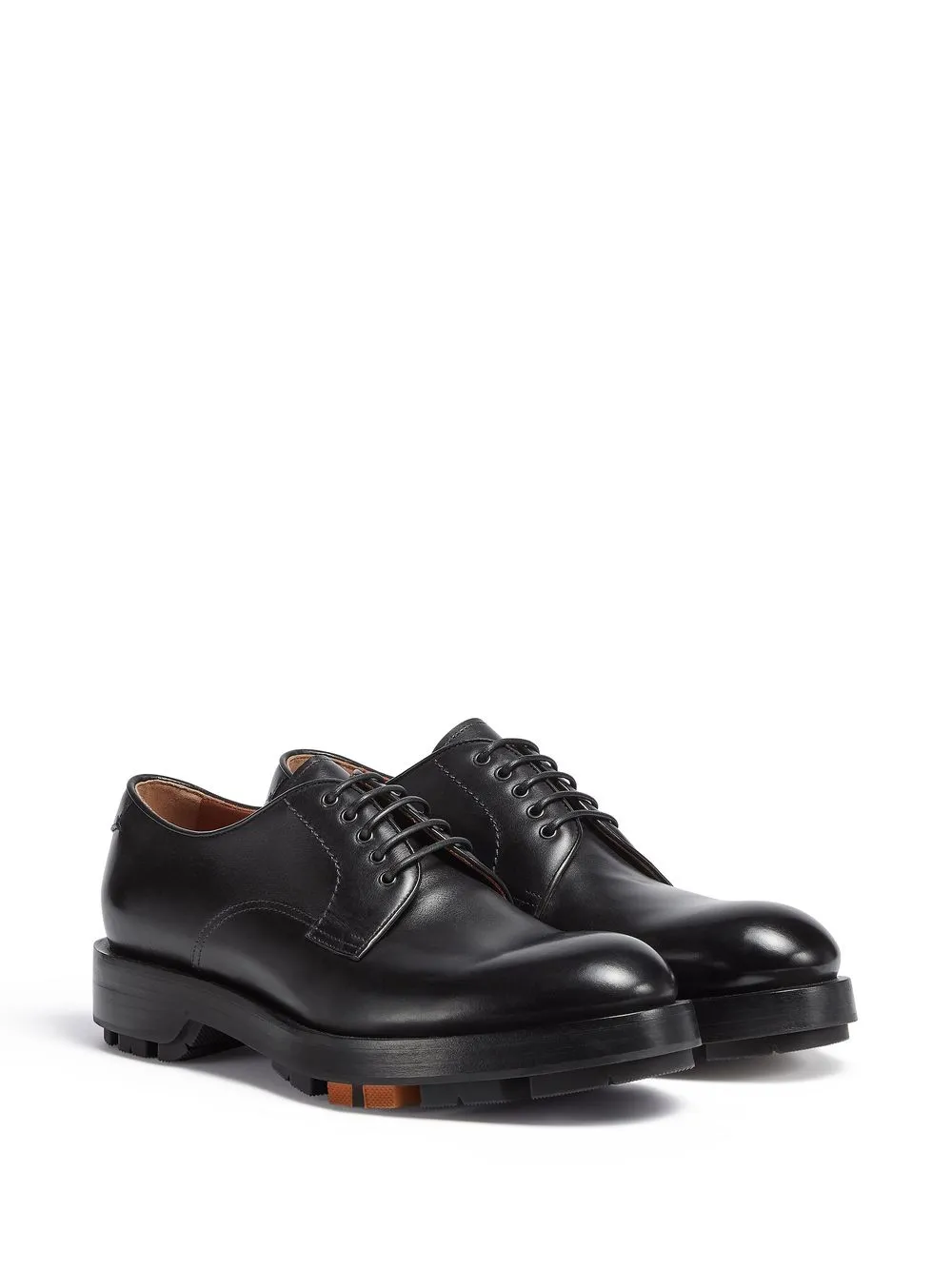 chunky-sole Derby shoes from Zegna featuring black, calf leather, round toe, front lace-up fastening, branded leather insole, low heel and chunky rubber lug sole.